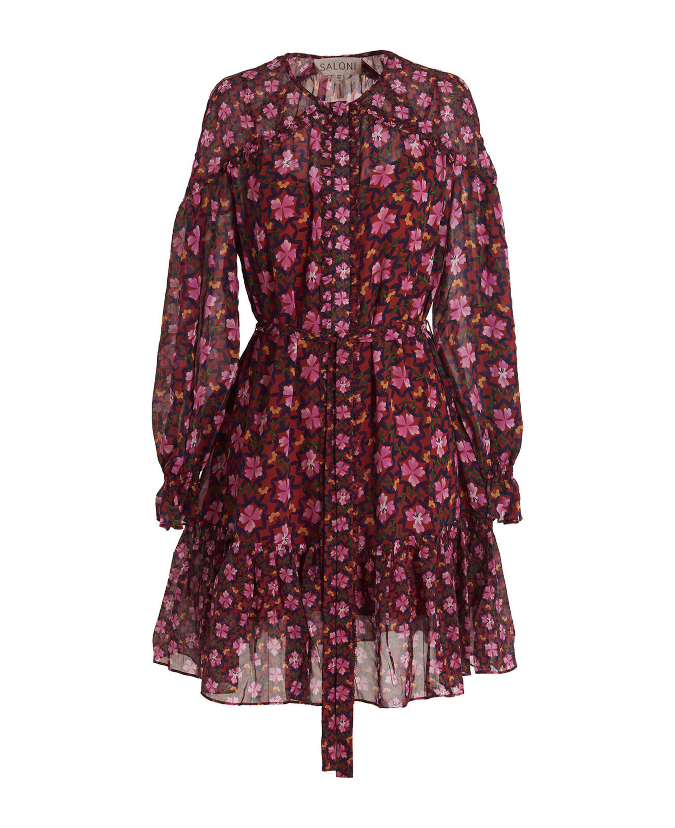Pixie' all-over floral print silk dress with front button closure, belt at the waist, crewneck, long cuffed sleeves, and a removable petticoat. Composition: 100% silk