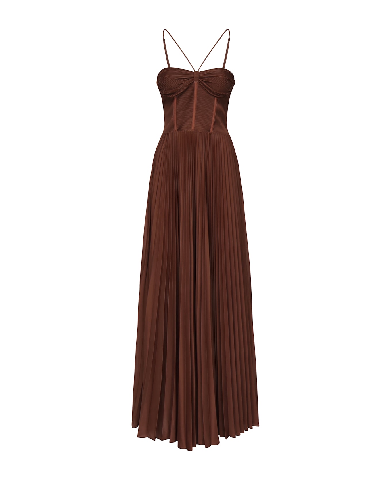 -Concealed side closure -Pleated skirt -Thin shoulder straps -Hearheart neckline -Made in Italy -Size shown in photo is XS -Colour: Cinnamon
