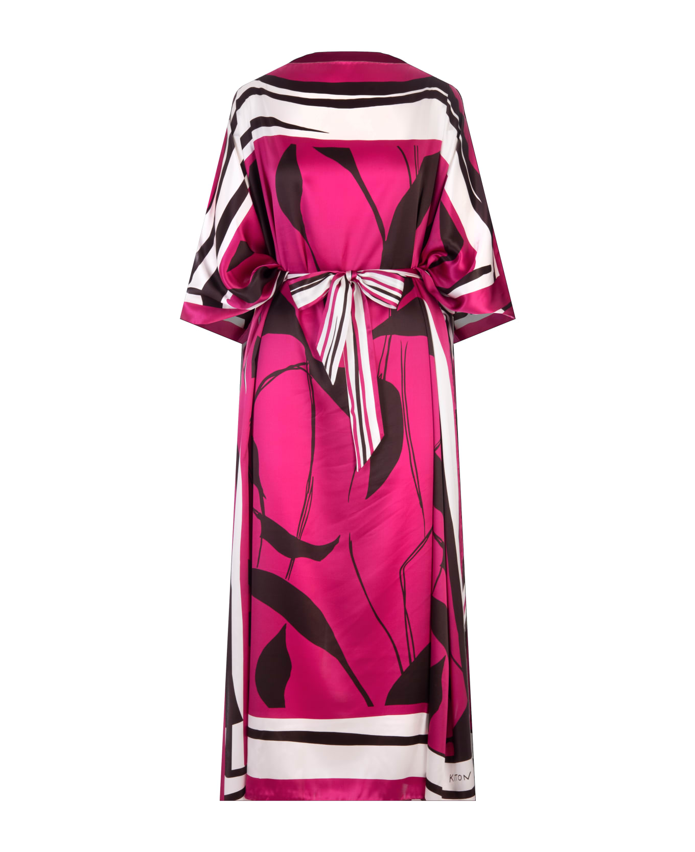 Ankle-length caftan dress signed Kiton made of precious silk printed with modern pattern. The garment consists of two sheets of scarf assembled from sleeve to sleeve, chromatically contrasting in the nunaces of white, black and fuchsia. Model finished with a removable belt to be knotted at the waist and hand-painted logo decoration. Size: 130x130 cm. Composition: 100% Silk