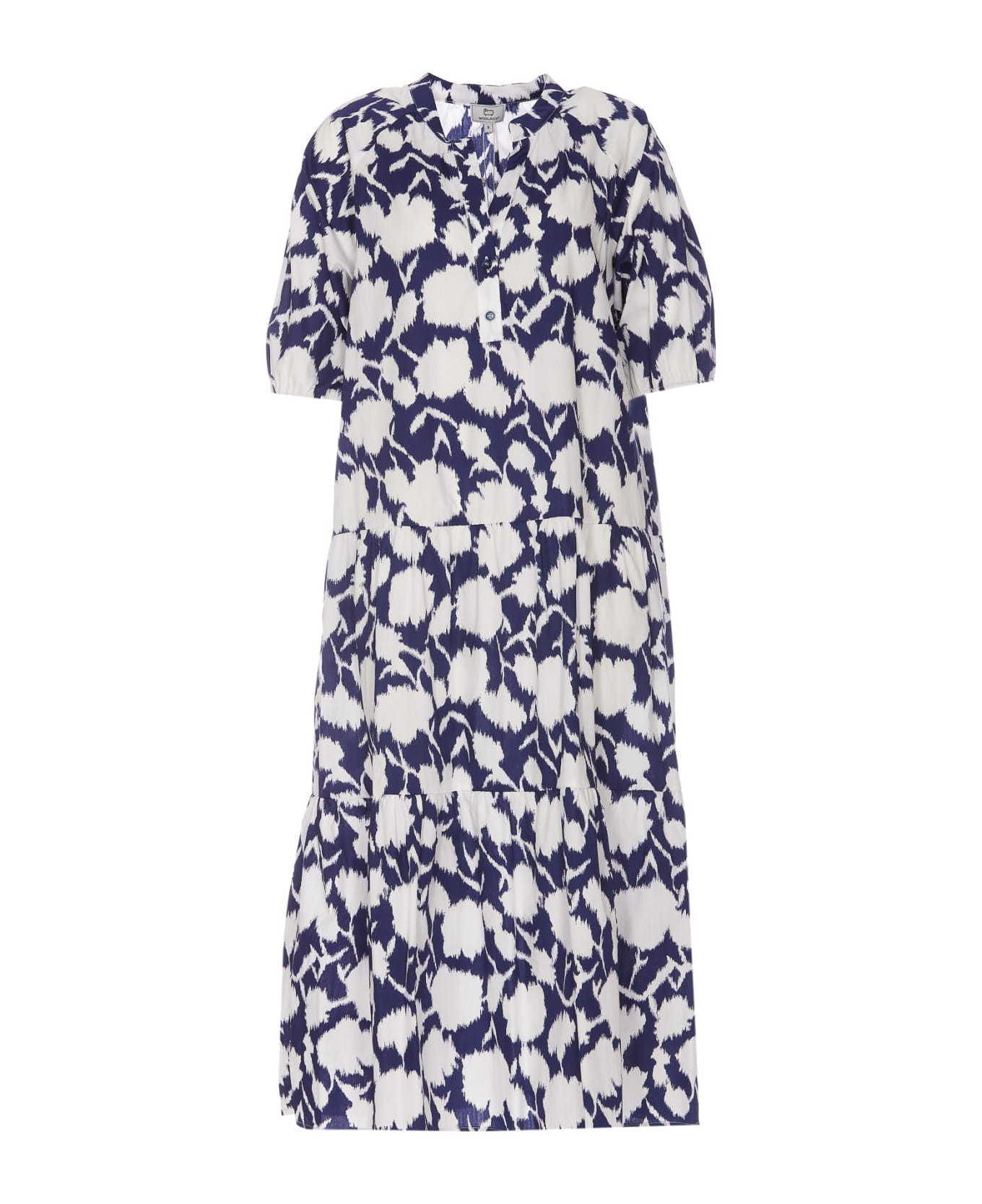 Woolrich printed white and blue long dress with frontal buttons closure, jacquard, 3/4 sleeves, V-neck