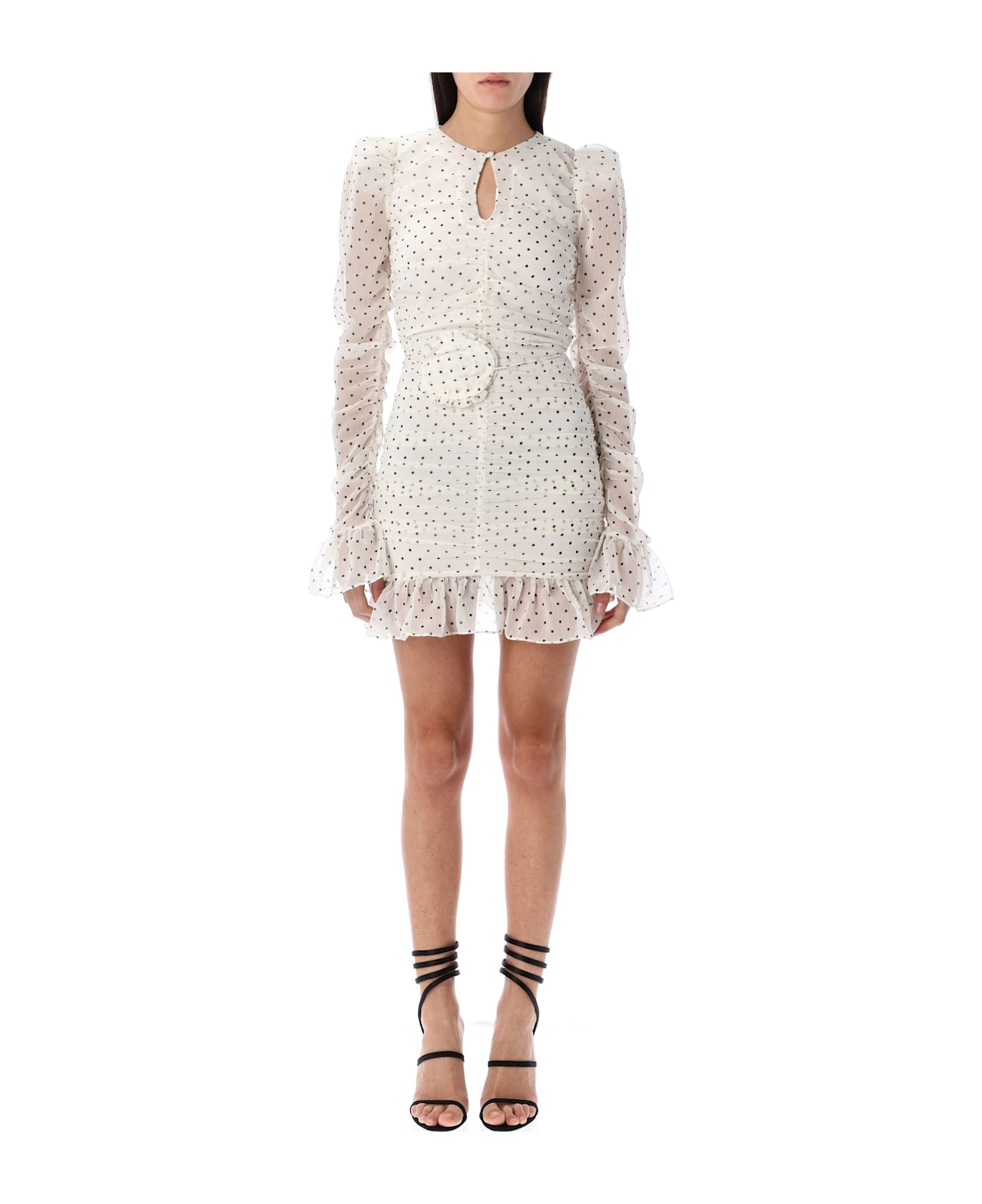 Printed Long-sleeve Mini Dress By Rotate. Featuring: Round Neck Keyhole Cutout At The Front Ruched Bodice Long Sleeves With Flared Cuffs Floral Accent At The Waist Back Zip Fastening Ruffled Hem Polka Dot Pattern Model Is 1,70 M And Wears Size 34