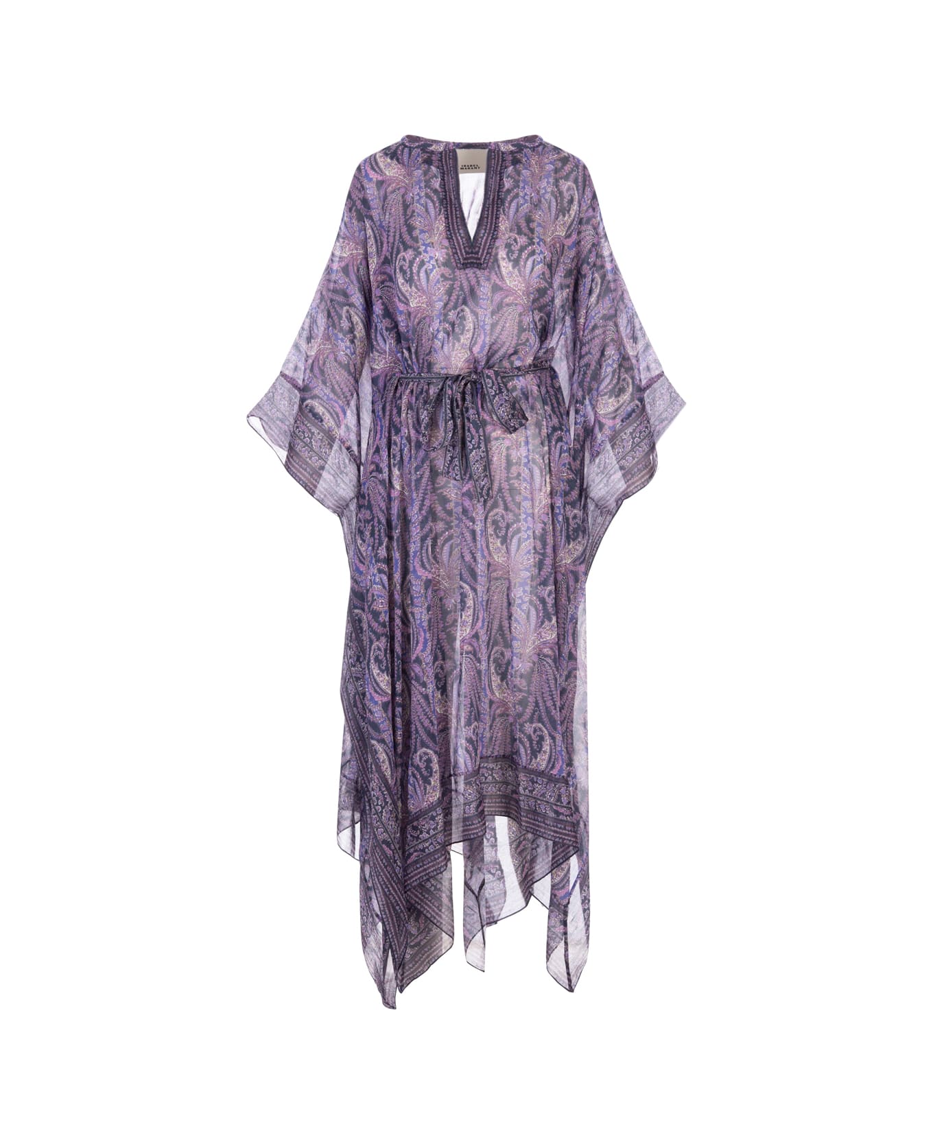 Bagadhi midi dress by Isabel Marant made from a silk and purple cotton blend with an all-over printed pattern. The design features a front V-neckline, wide long sleeves, a drawstring waist, and a flared design with an asymmetric hemline.
