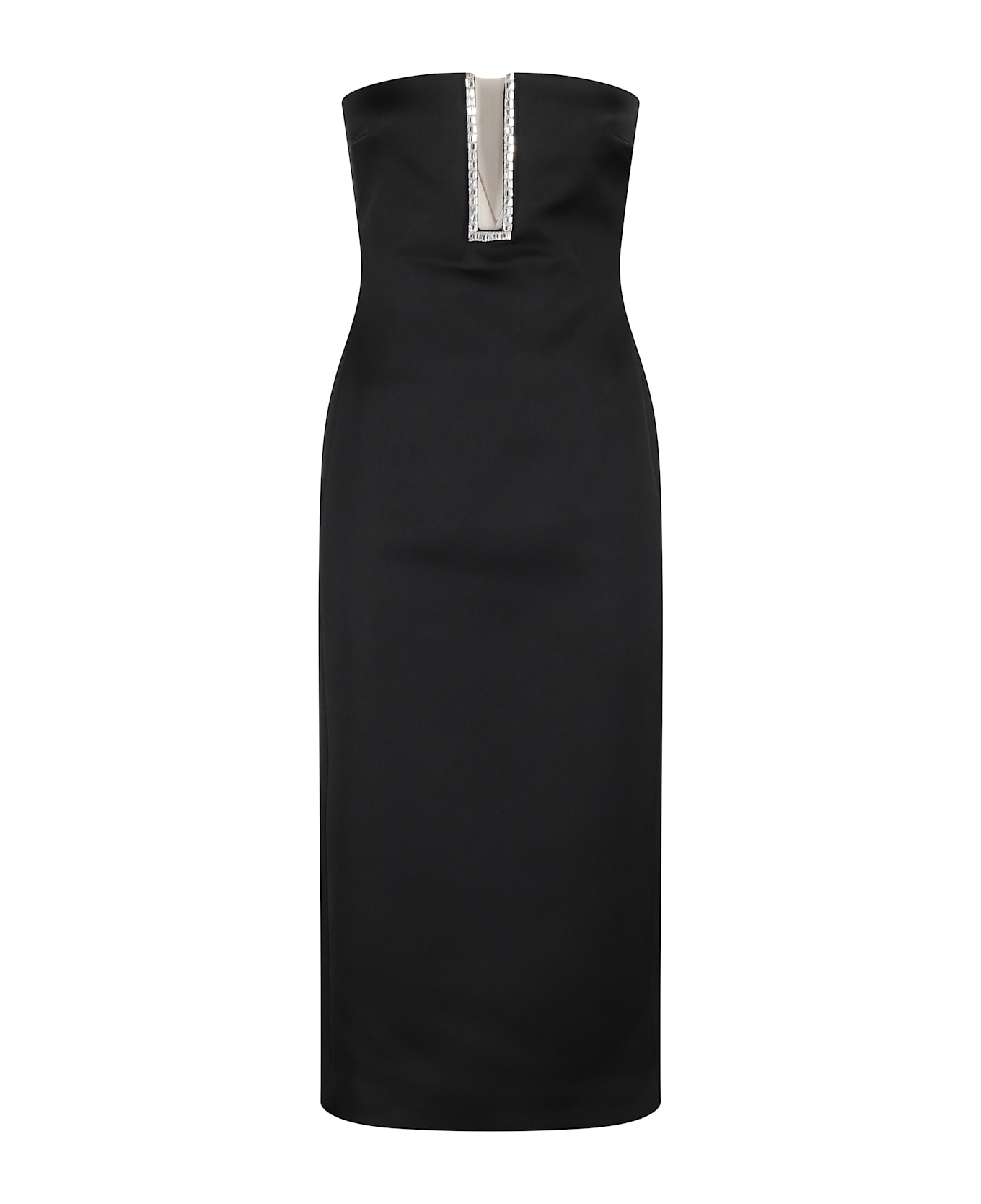 Midi Dress - David Kima - black color - straight neckline - rectangular cutout with silver crystals - back zipper closure - midi pencil skirt - back slit - slim fit