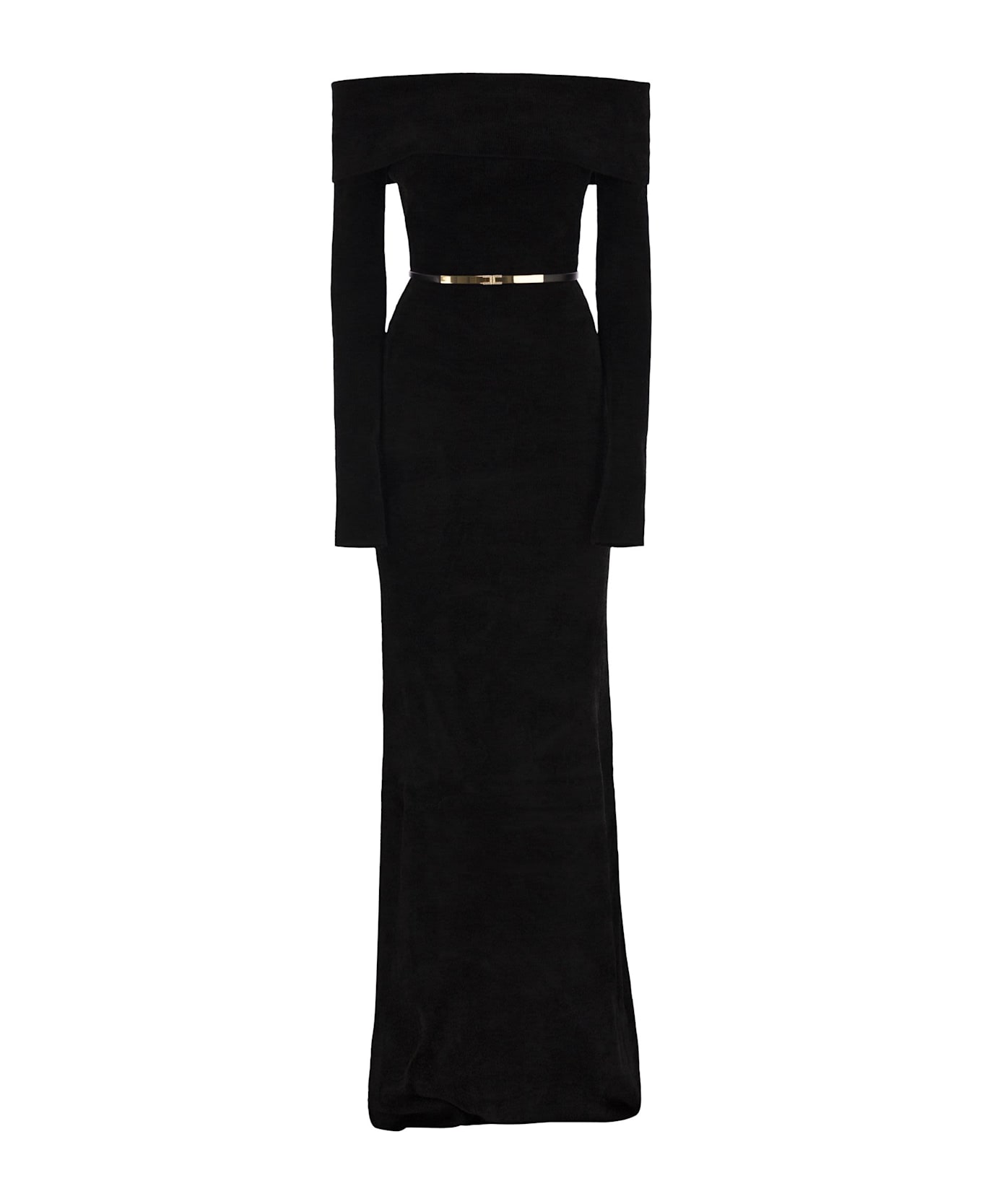 Fitted chenille evening dress. The dress has long sleeves and features a wide boat neckline, folded over to wrap around the shoulders and create a harmonious silhouette. The tubular belt has gold metal detailing and is removable for more styling options. - Belt with logo - Slim fit - Folded over the shoulders DESIGNER ID: AM34S57E2 110