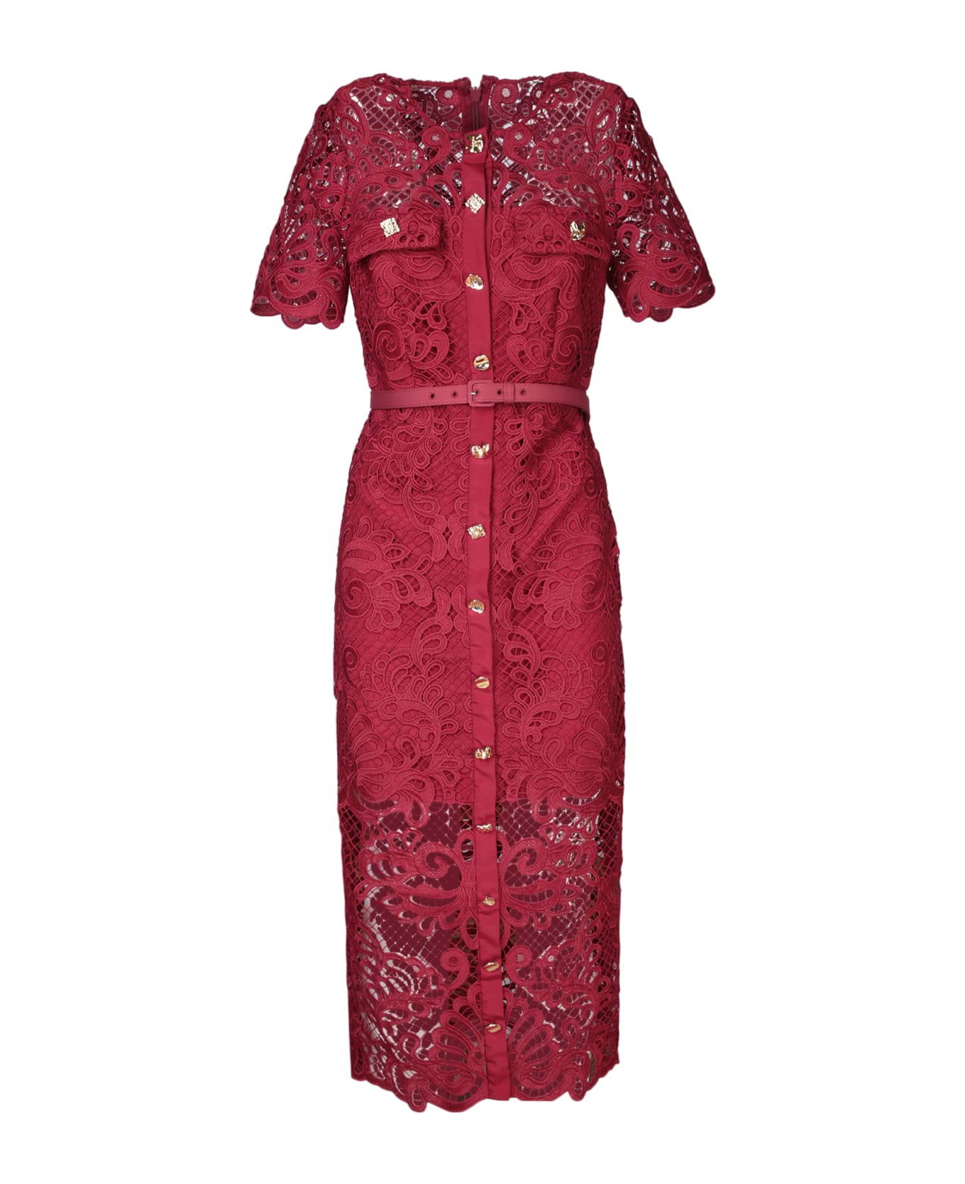 This deep red lace midi dress by Self Portrait features an intricately embroidered design with meticulous details. The silhouette is enhanced by a waist belt that accentuates the figure, making it ideal for formal occasions and elegant evenings.