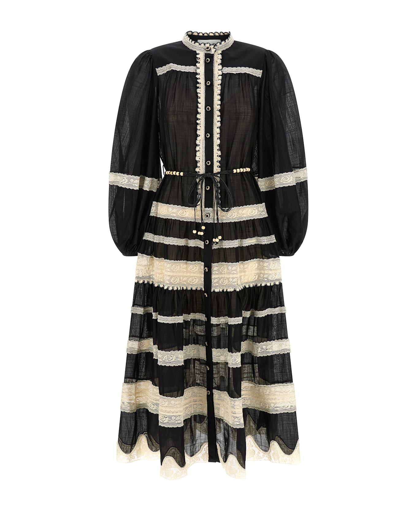 Rhiannon Lace Billow' sectional cotton midi dress with crochet lace trim, high neck, front button closure, long puff sleeves with elastic cuffs, removable wooden beaded belt, and removable petticoat.