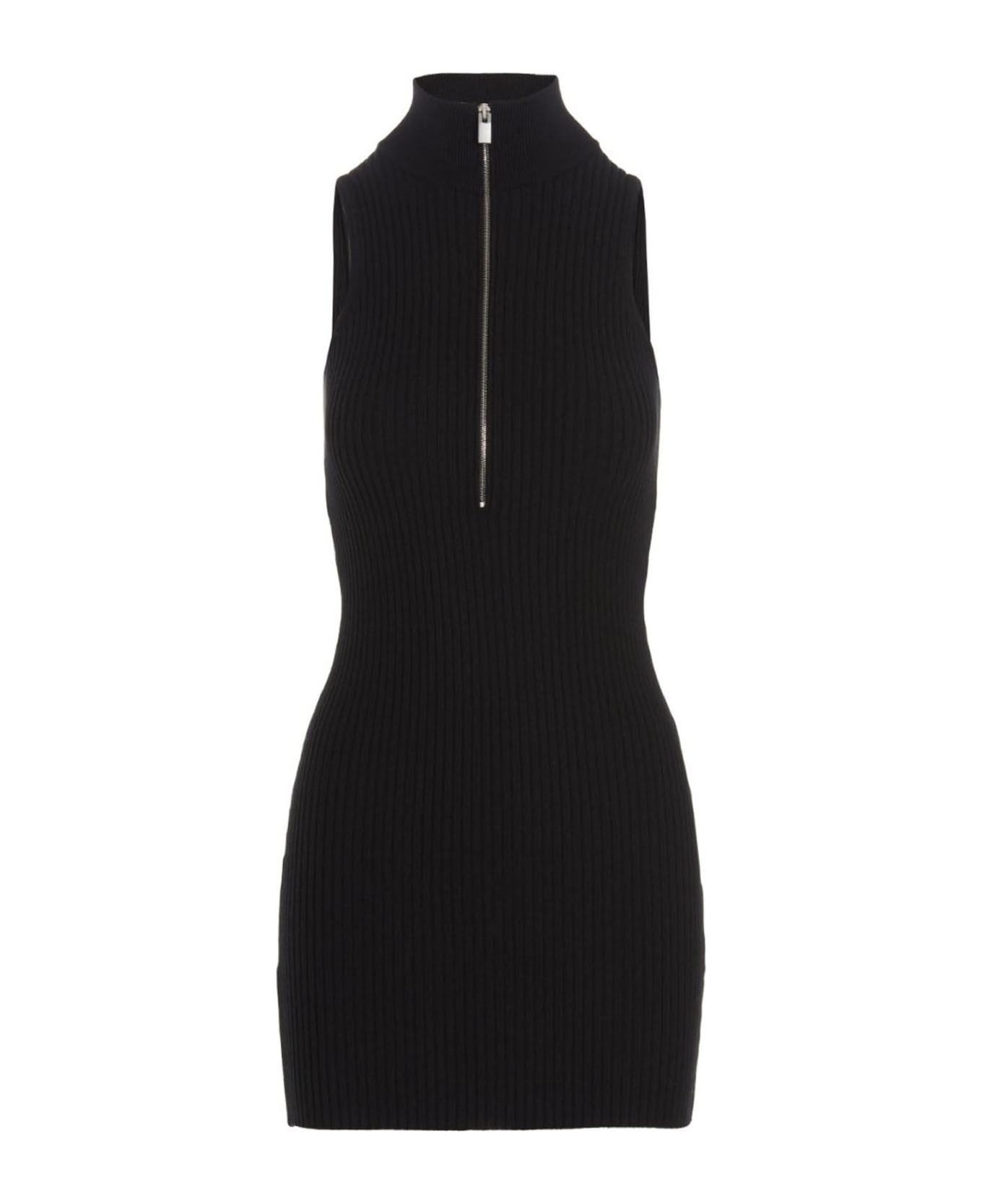 Ribbed knit dress with high collar with half front zip and a sleeveless style. ont.
