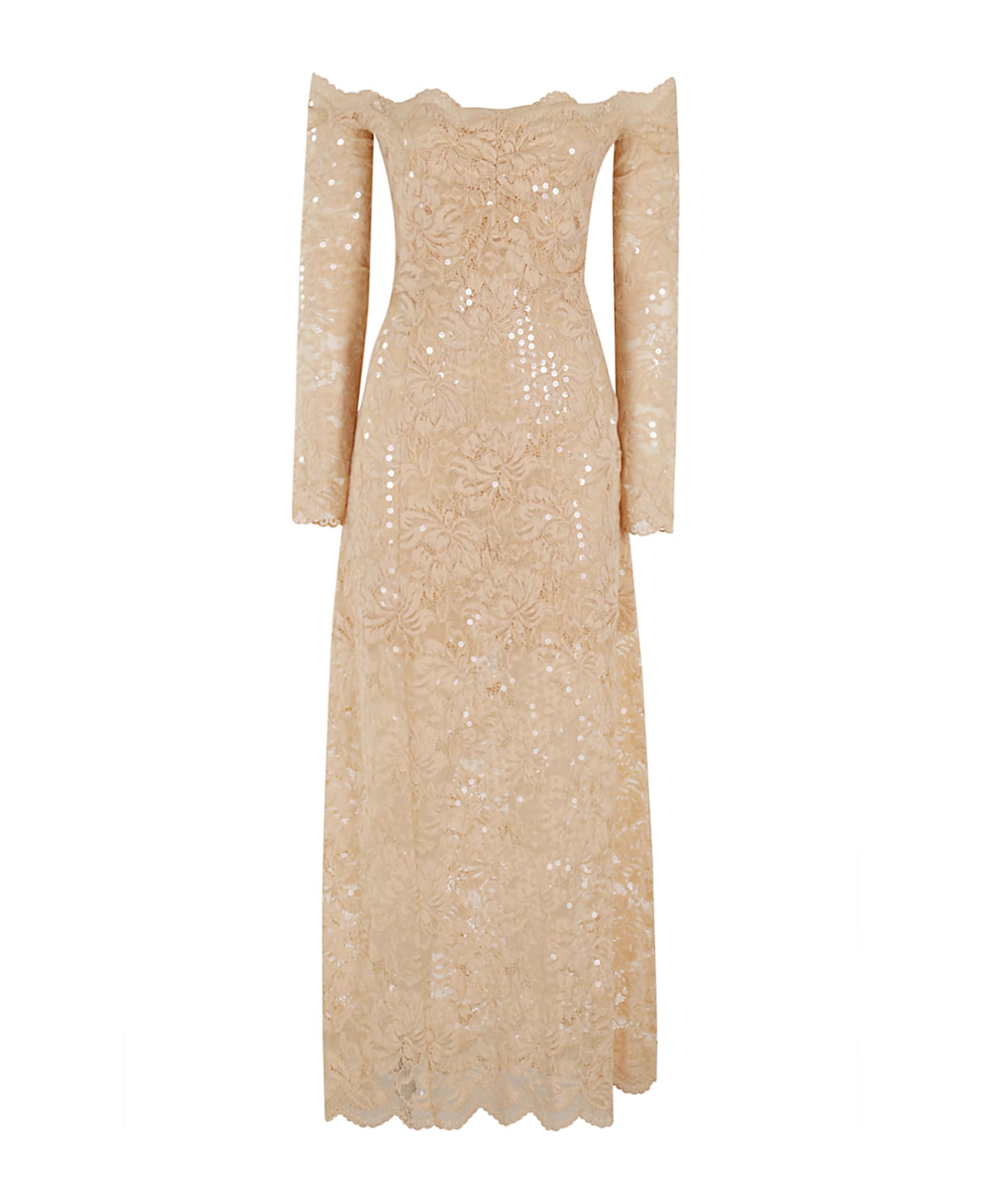 Dress - Rabanne - Raffia color - Stretch lace fabric with sequin inserts - Draped boat neckline with scalloped profile - Semi-sheer long sleeve - Scalloped profile hem - Ankle length - Fitted fit