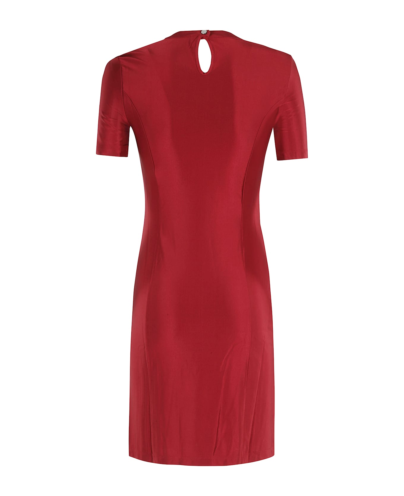 Mini dress - Rabanne - ruby red color - crew neck - half sleeves - side drape with snap buttons - back button closure - asymmetrical hem - above-the-knee length