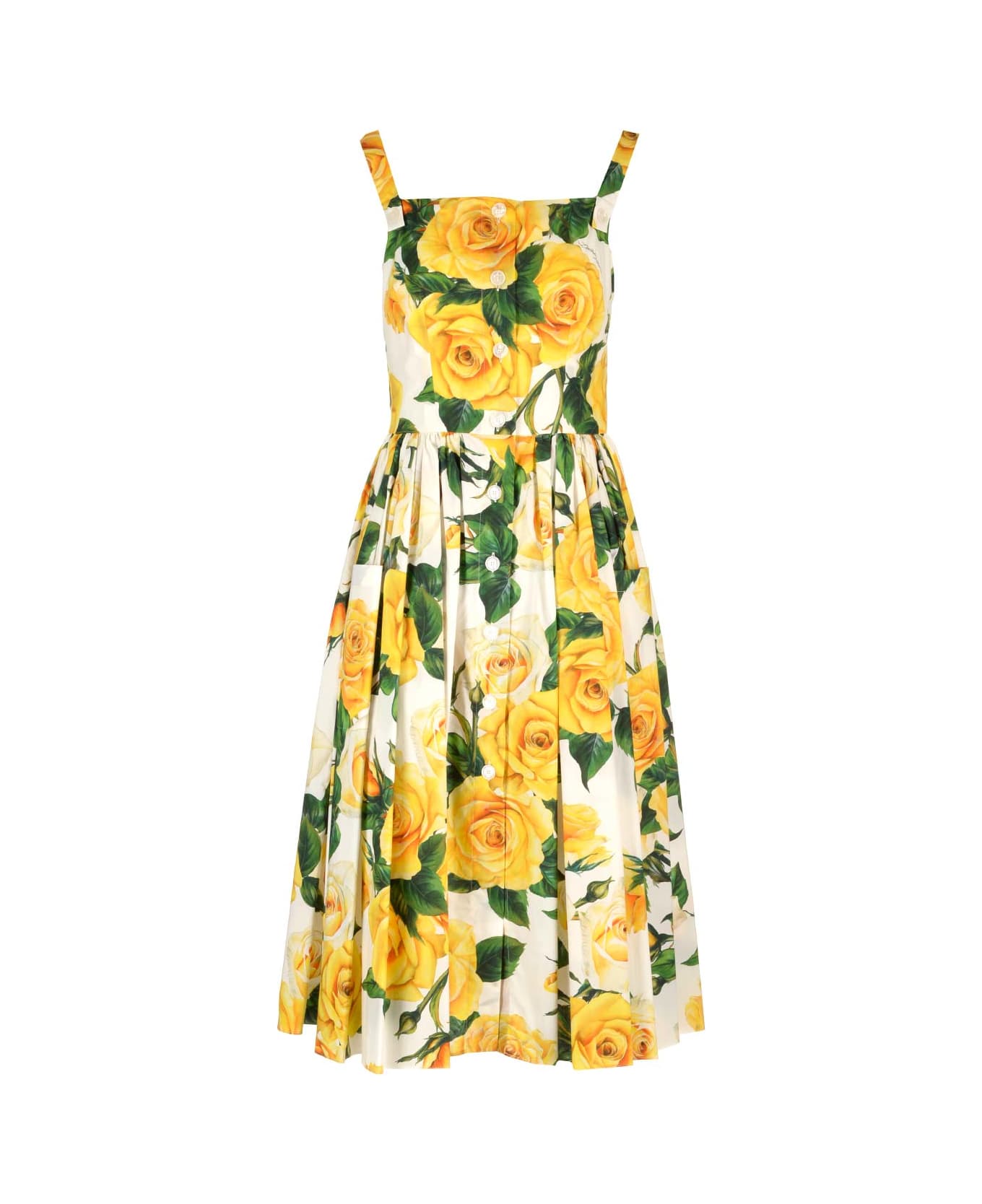 Cotton midi dress with yellow roses print from Dolce & Gabbana, with square neckline, voluminous pleated skirt, buttons along the entire length. Composition: C. W. : COTTON - 100%CO 97%CO+03%EA