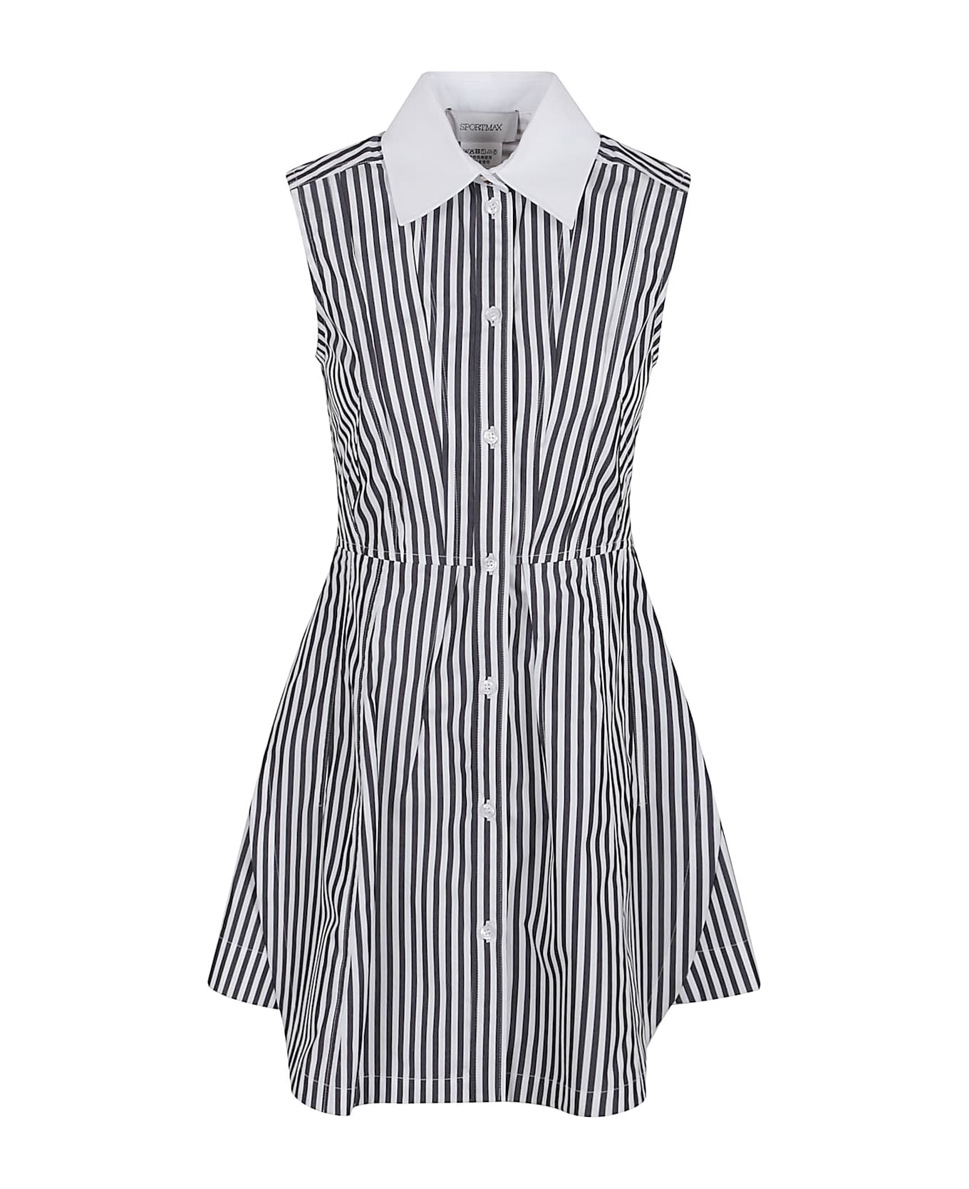 abito camicia smanicato a righe con bottoni sul davanti e cucitura in vita, svasato dalla vita
