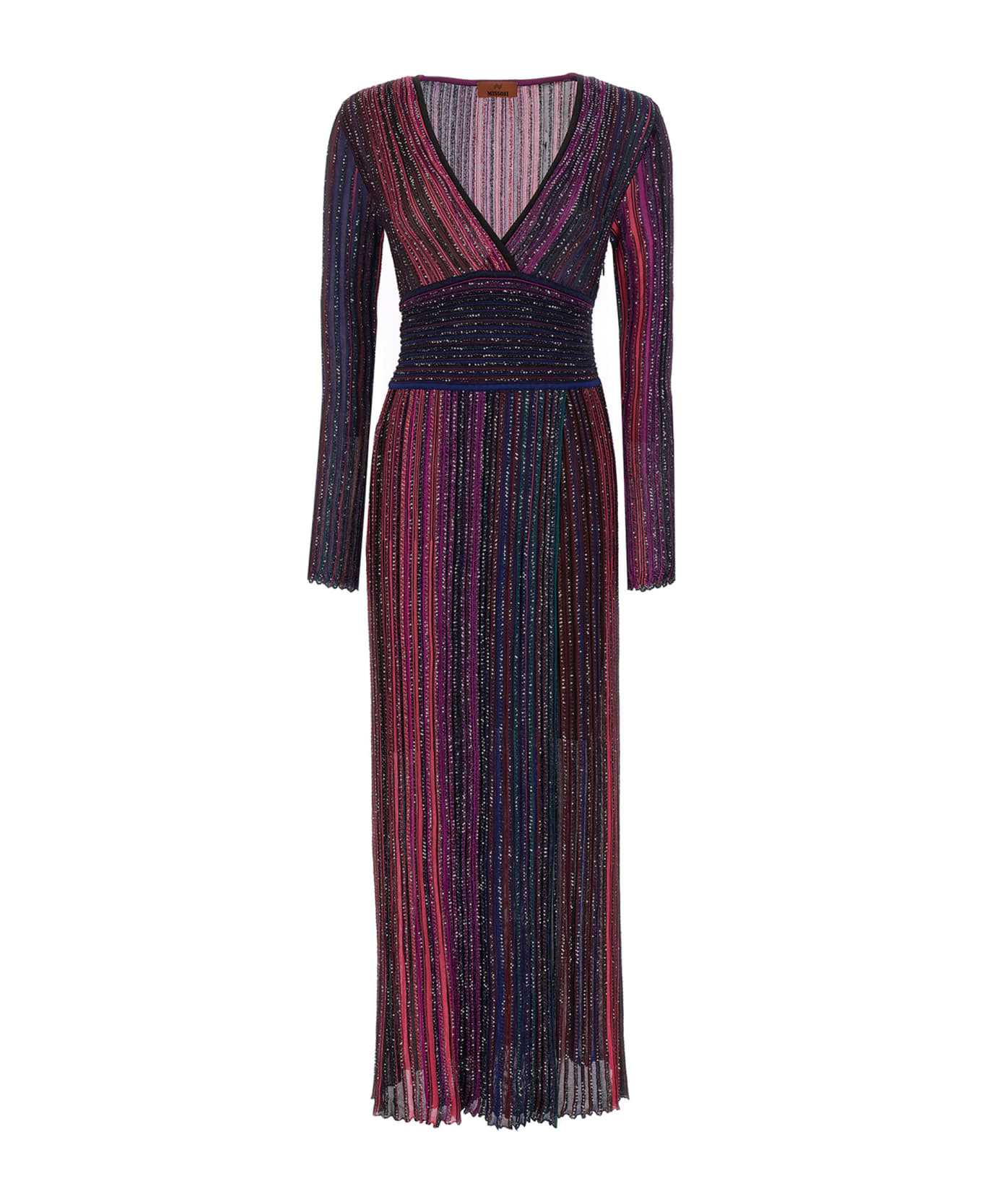 Long striped viscose blend dress with sequin appliqué, V-neck, elastic waistband, long sleeves, front split, and removable underskirt. Composition: 85% viscose 8% polyamide 5% polyester 2% met