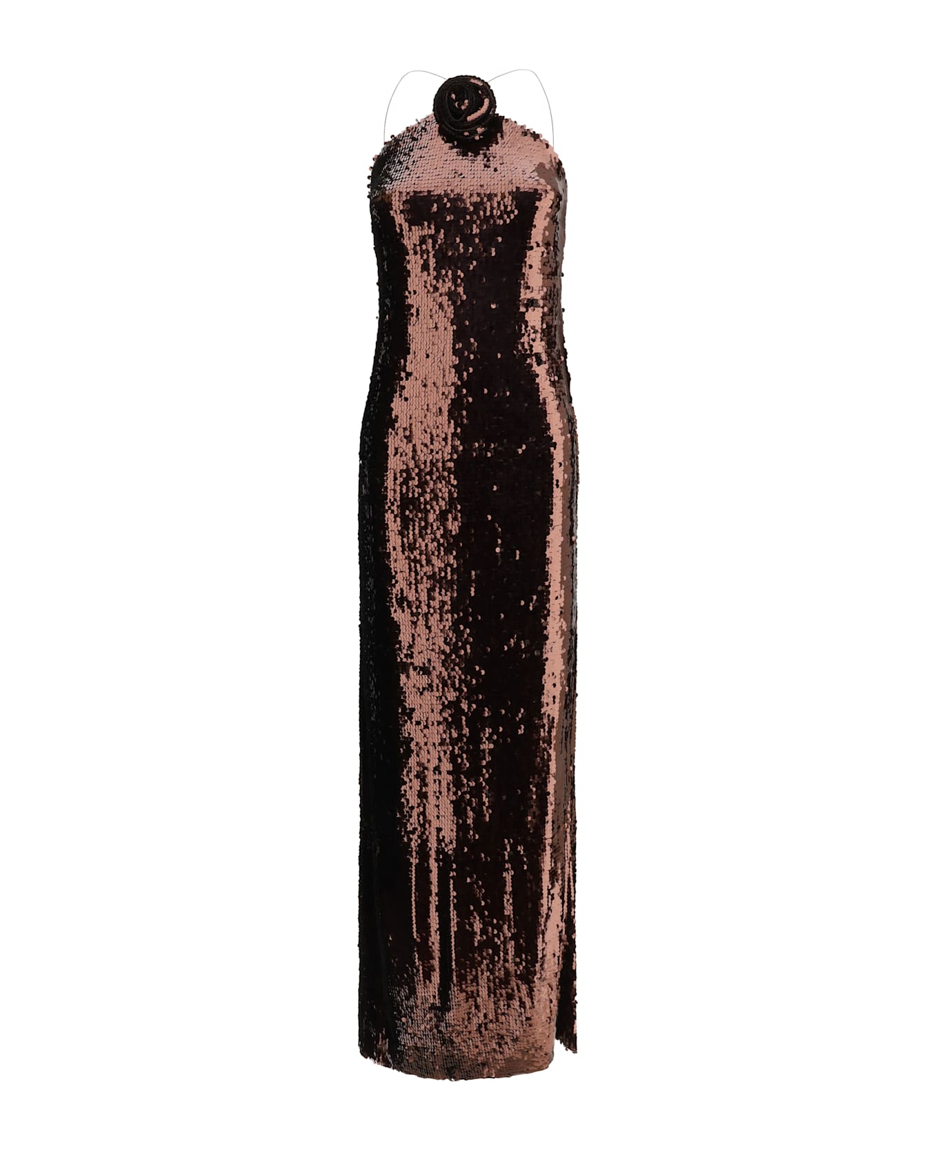 Magda butrym's sequin long dress is an elegant and refined piece featuring a plunging neckline at the back embellished with a knotted tie. sleeveless and with a halter neckline, it features an iconic rose detail on the front, adding a distinctive and feminine touch to this sparkling and sophisticated design.