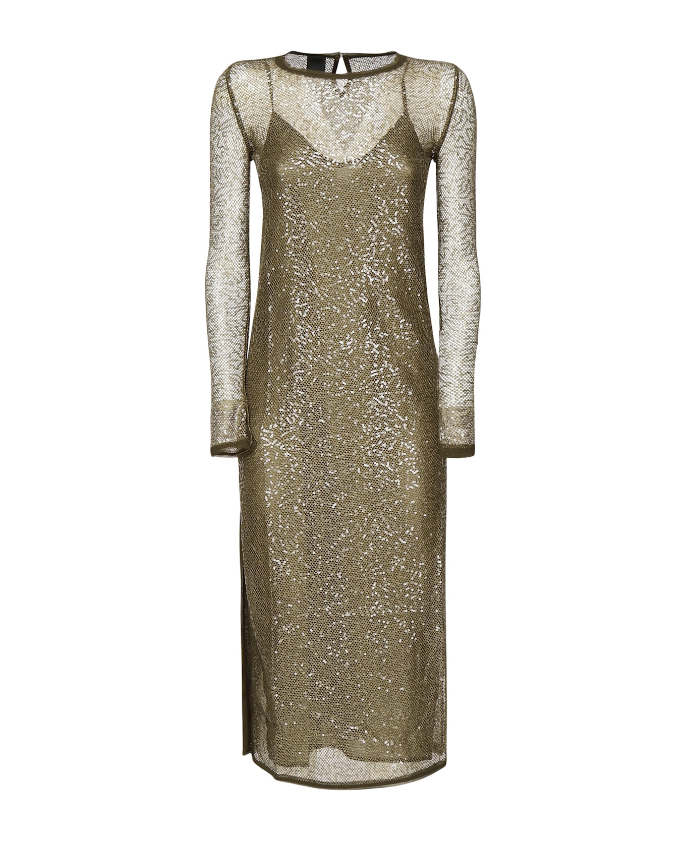 -Made of technical mesh fabric decorated with sequins -Tight fit -Side slits at the bottom of the garment -Matching slip -The size shown in the photo is 38 IT -Color: Military green
