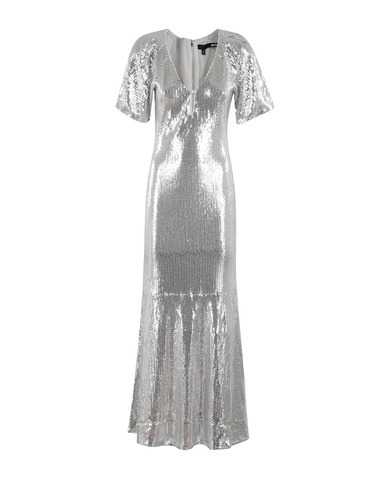 Sequin Midi Dress - Rotate - silver color - all-over sequins - V-neck with button closure - half sleeves - back zipper closure - mermaid skirt with flared bottom - toe length - fitted fit