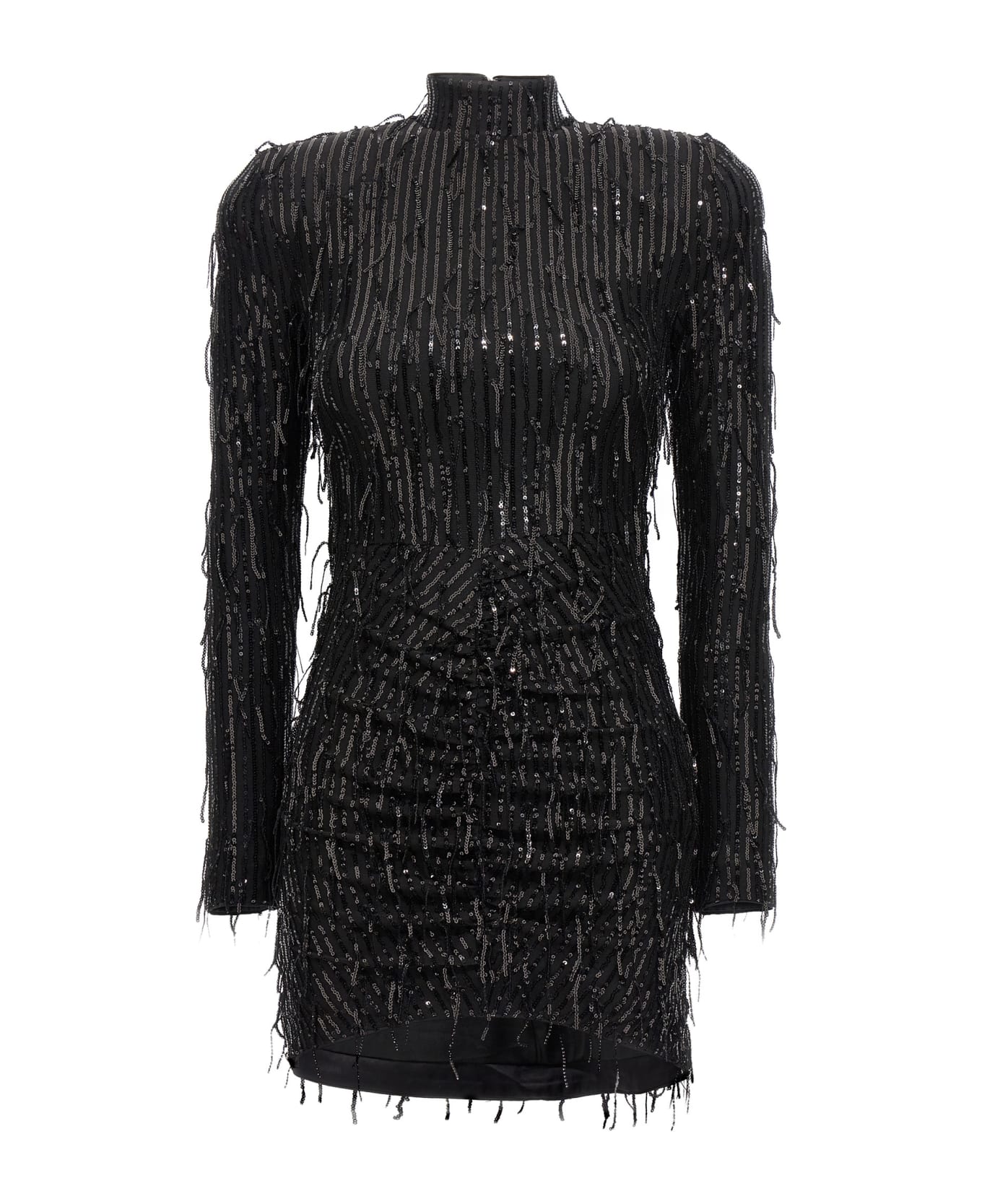 Mini dress in stretch fabric, long sleeves, high neck, all-over fringed sequins.