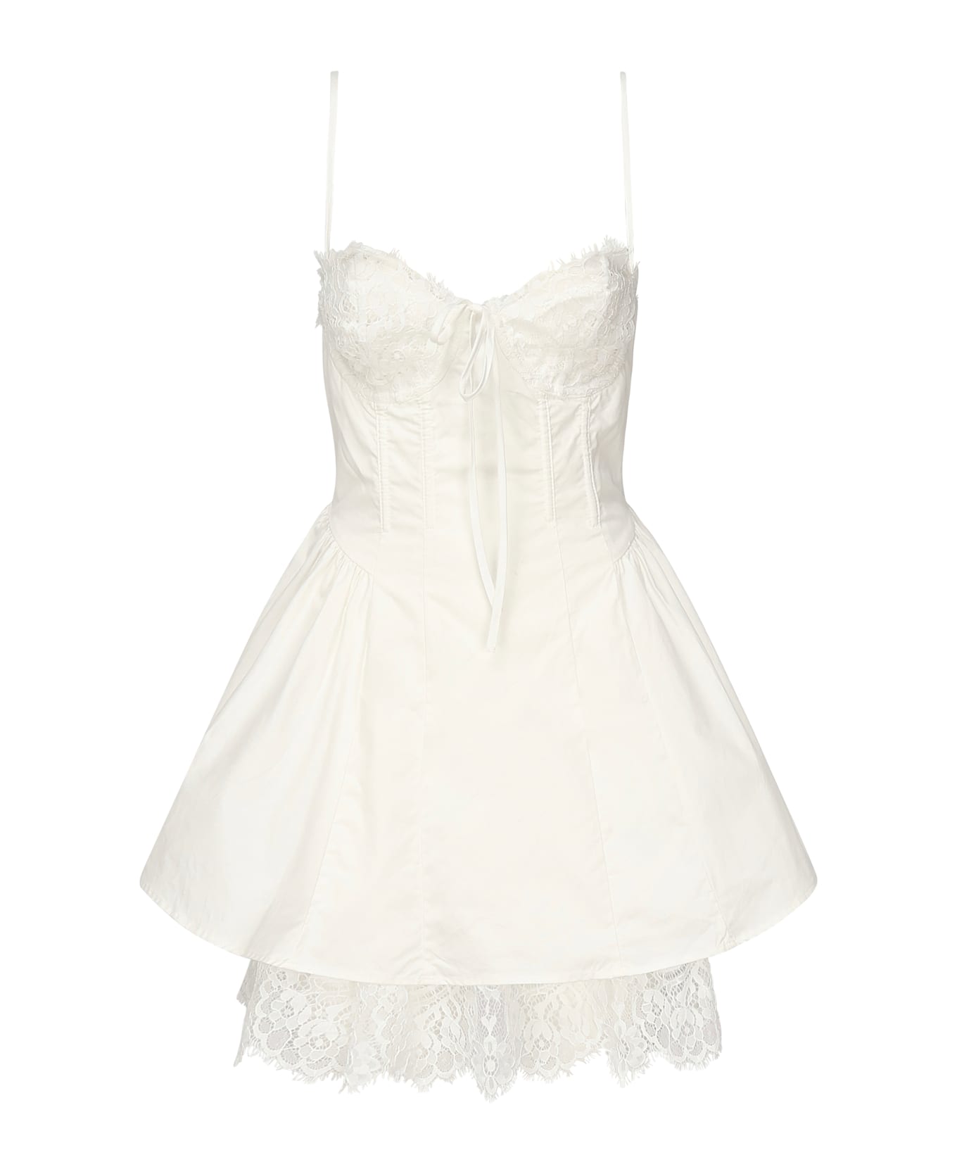 -Made of poplin and lace -Adjustable shoulder straps -Invisible zipper at the center back -Underwired cups -Flared skirt -The size shown in the photo is M -Color: White