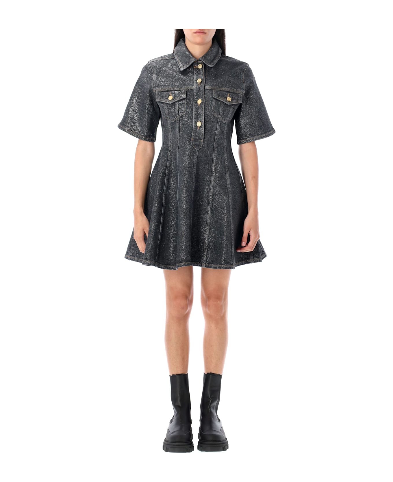 Organic Cotton Shimmery Foil Denim Mini Dress By Ganni. Featuring: Point Collar Front Button Closure Short Sleeves Chest Flap Buttoned Pockets Engraved Logo Gold-tone Buttons Fitted Waist Flared Skirt Model Is 1,70 M And Wears Size 36