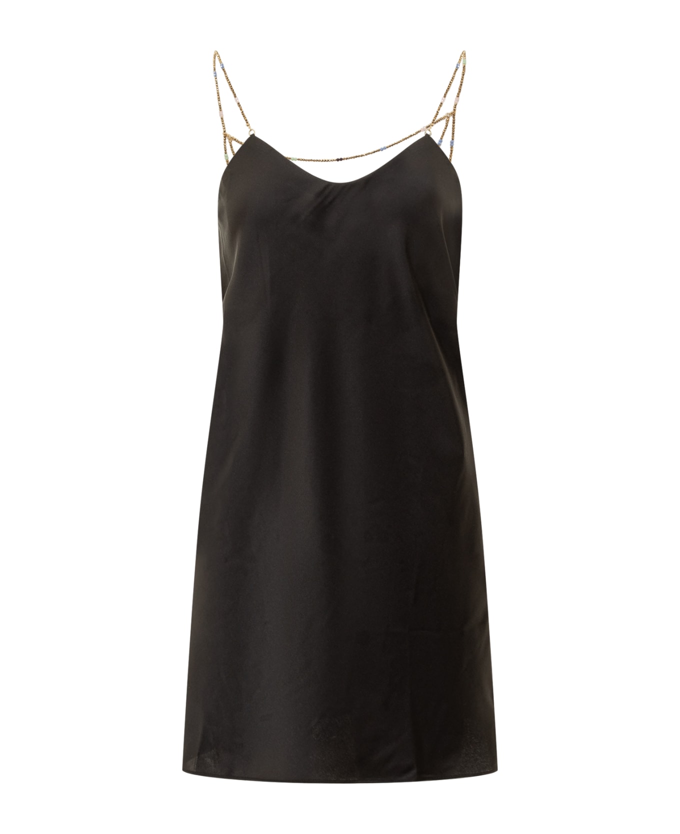 Short dress. Round neckline. Metal straps woven on the back. Cut out on the back.