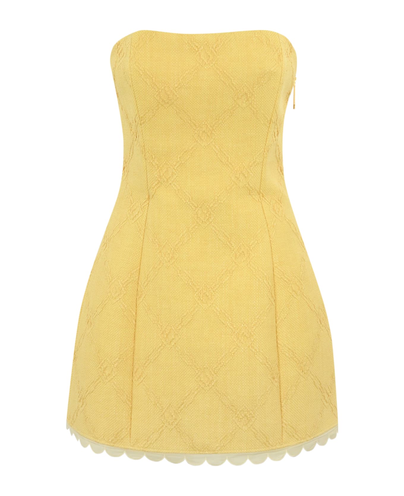 women's short dress: rafia sleeveless slightly sweetheart neckline 3d logo texture corset-style crisscross laces at the back side zip fastening embroidered scalloped hem cotton muslin lining slim fit composition: 100% polyamide