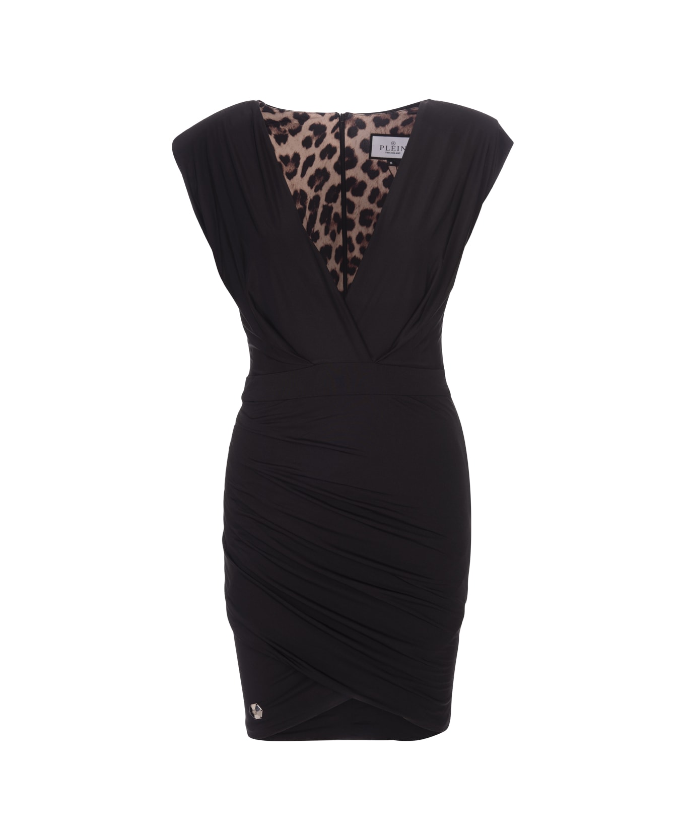 Sleeveless mini dress by Philipp Plein made of black shiny-effect stretch jersey fabric and featuring draping, padded shoulders, animal-print lining and a deep neckline that ends at the waist. Center back hook-and-eye and concealed zipper closure.