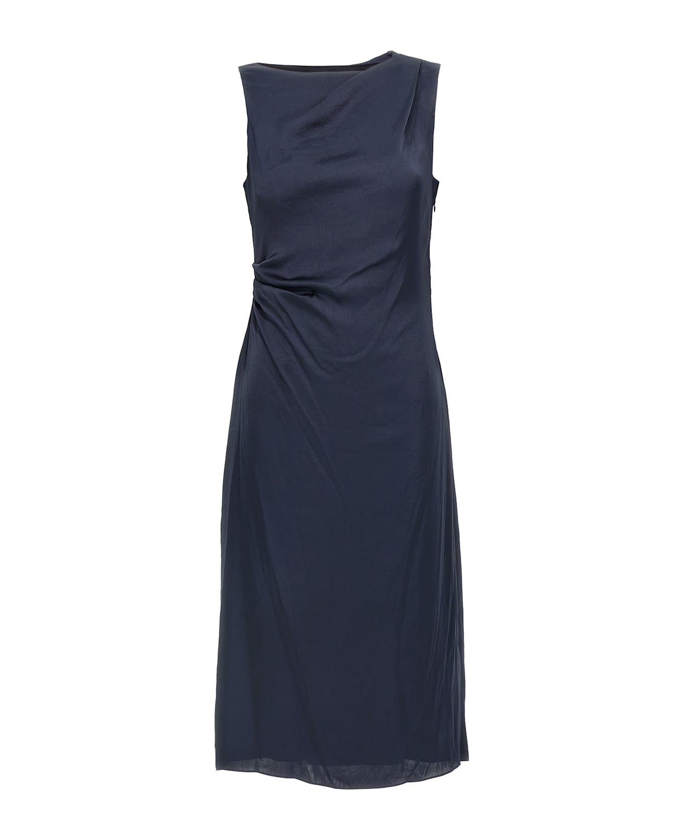 Crinkled silk-effect fabric midi dress with round neckline, sleeveless, draping and curling at the waist, side zip closure, back split, lining.