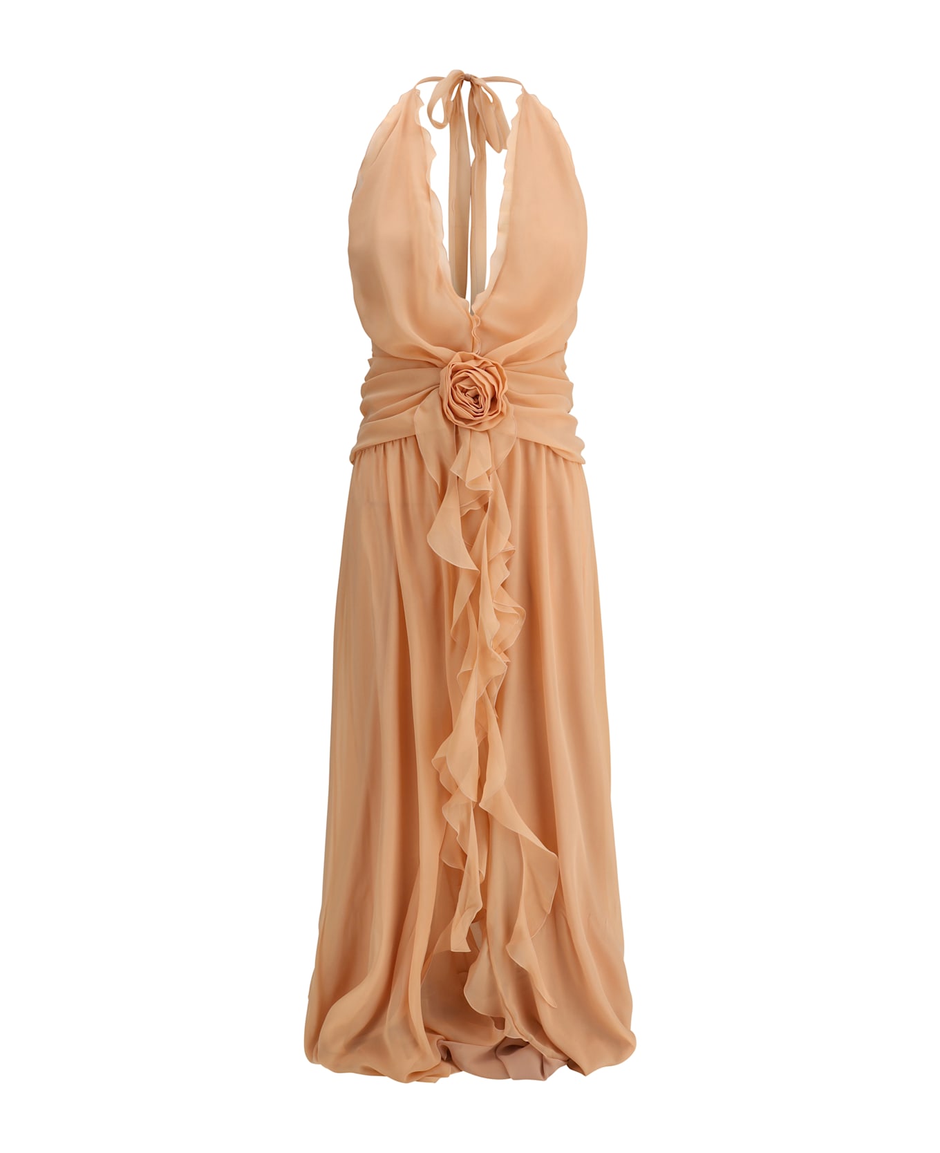 The blumarine silk georgette long dress is a sophisticated and sensual piece, perfect for those seeking an elegant yet bold look. crafted from fine silk georgette, the soft and flowing material glides delicately over the skin, creating an ethereal effect. the wide halterneck, which can be tied at the back, adds a touch of seduction and refinement, while the back zip and hidden hook fastening ensures a perfect fit. the floral appliques on the front add a romantic and decorative detail, while the deep front slit gives the look an accent of sensuality and movement. an attention-grabbing dress, ideal for special occasions when you want to make a strong impression.