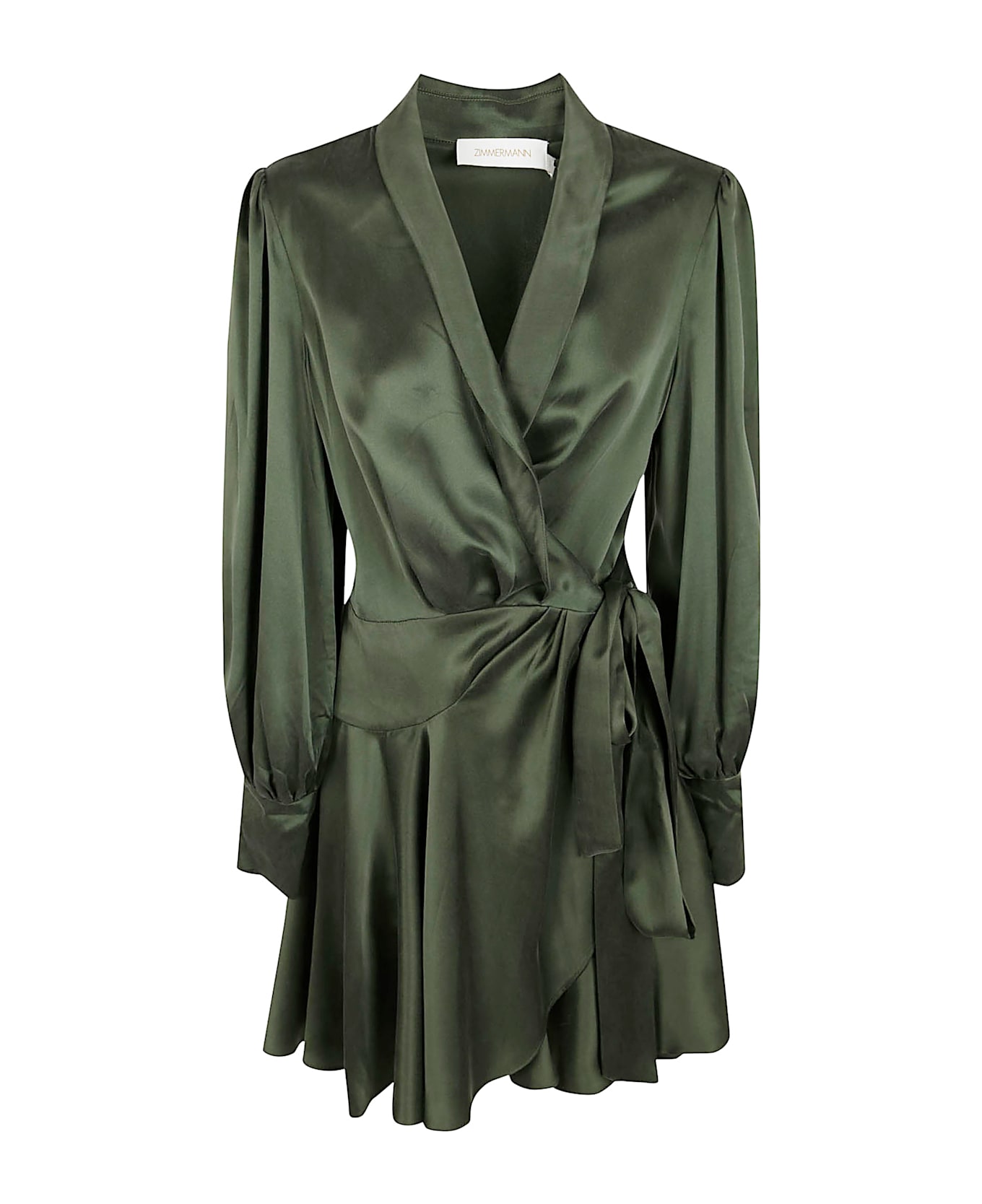 "Dark green silk wrap with a ruffled hem, long sleeves, and a v-neckline. "