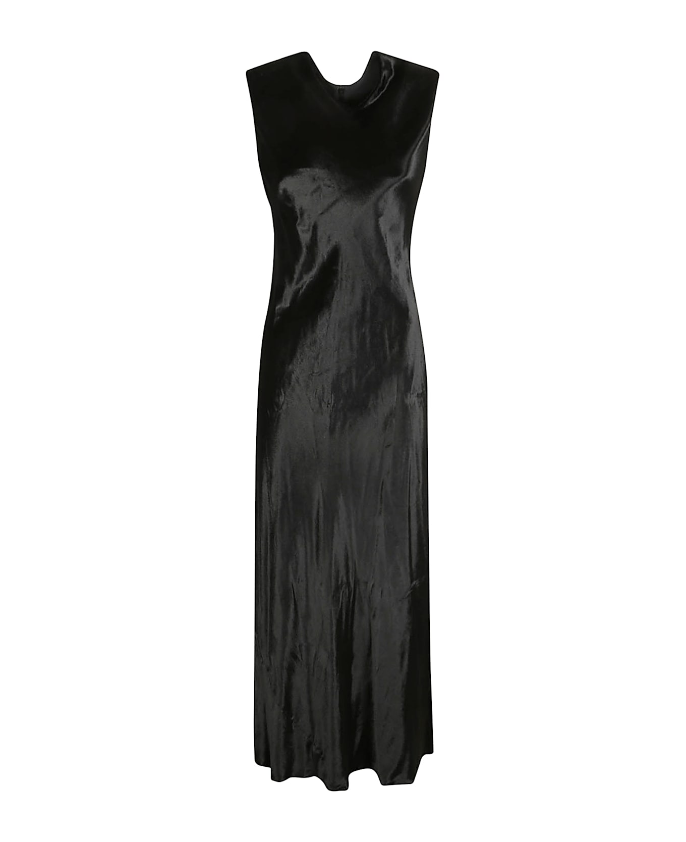 Shiny velvet midi dress with a flared skirt that reaches just above the ankle.