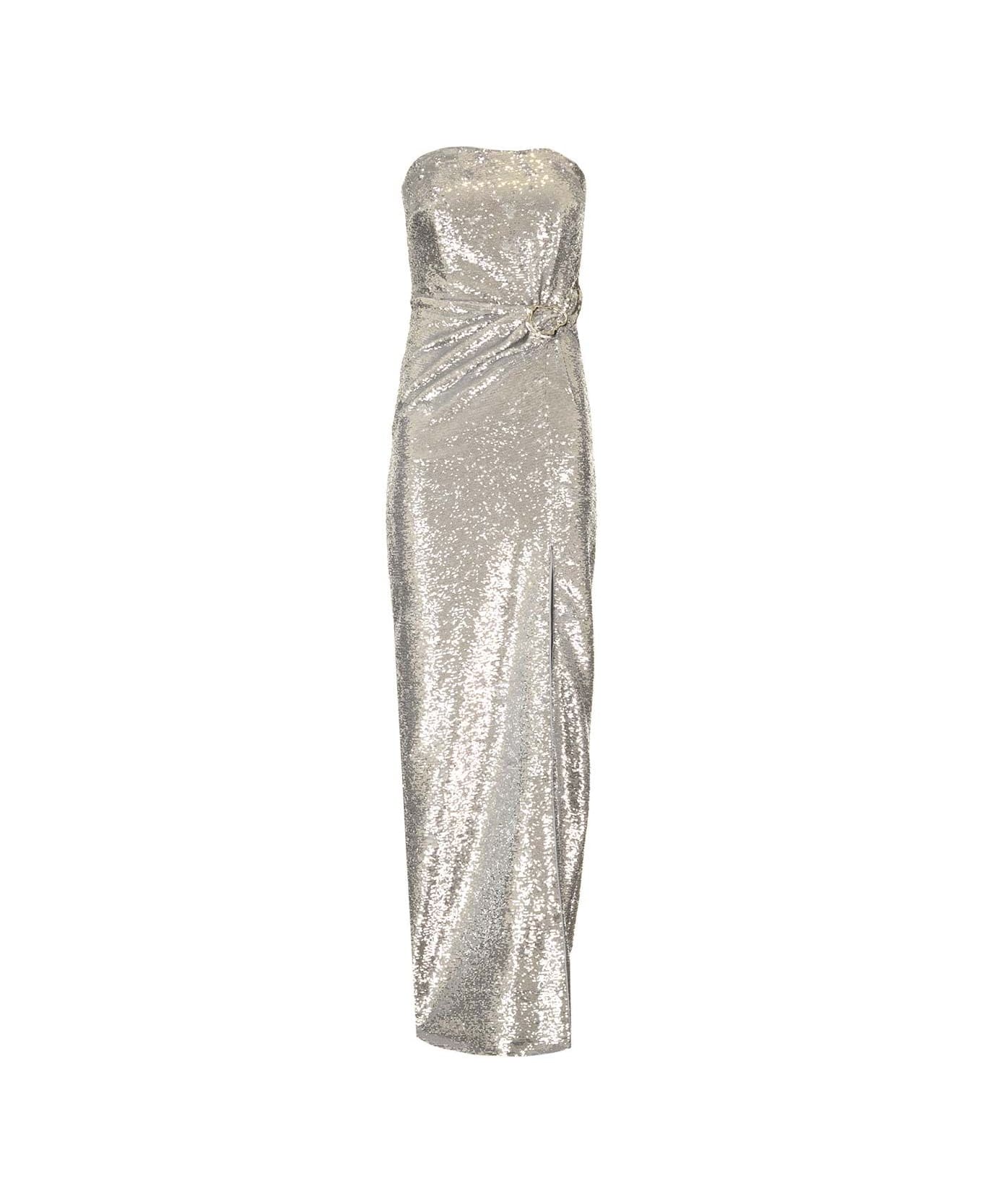 Strapless sequin gown from Rolan Mouret in silver sequins, with lateral drape and buckle embellishment. Floor-length skirt, front side slit, internal corset. Fully lined.
