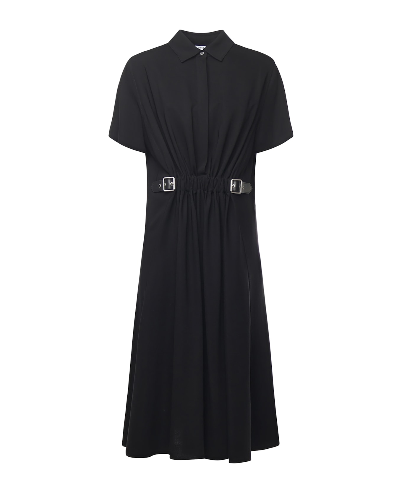 -Made of stretch viscose cady -Front button closure -Classic collar -Tone-on-tone leather belt -Made in Italy -The size shown in the photo is a 36 -Color: Black
