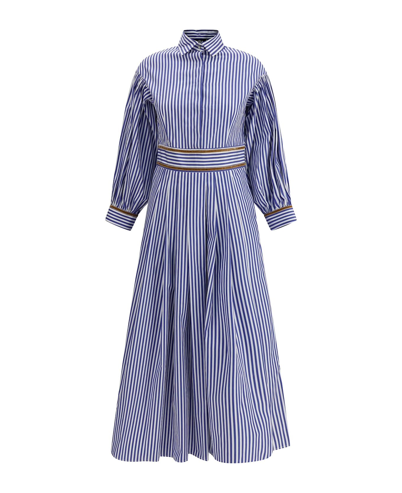 Ella's striped chemisier dress is an elegant, contemporary piece with a classic collar that enhances its refined style. the mid-bust button closure adds practicality, while striped side bands with corduroy detailing lend a touch of originality and texture. the hidden side zipper ensures a perfect fit without compromising the clean design of the dress. an ideal look for those seeking elegance with a modern accent.
