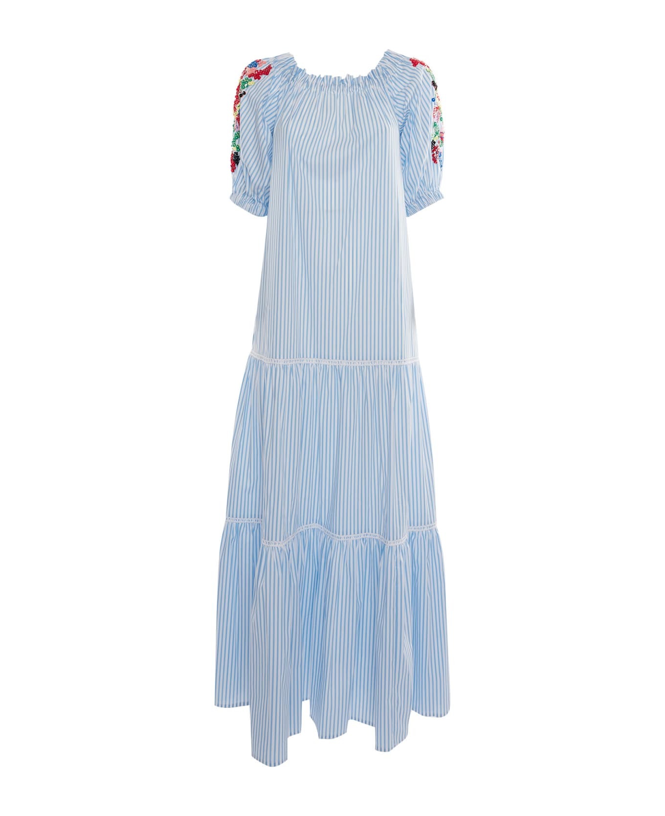 Stretch cotton blend dress, striped print, gathered neckline, multicolor sequin applique, short sleeves with elasticated edge