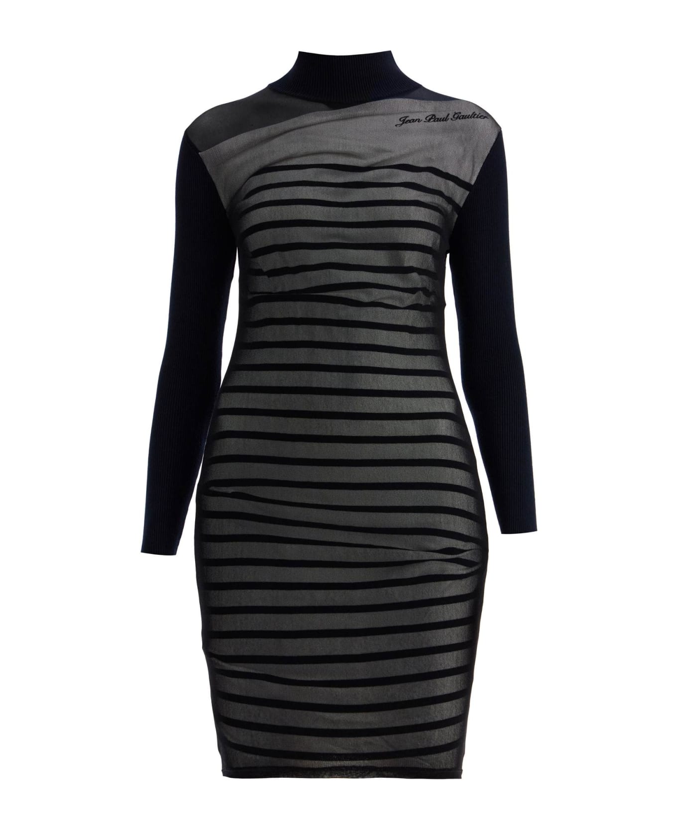This Jean Paul Gaultier mini dress is made of ribbed technical knit and tulle. It features a high neck and a fitted silhouette. The model is 177 cm tall and wears size S.