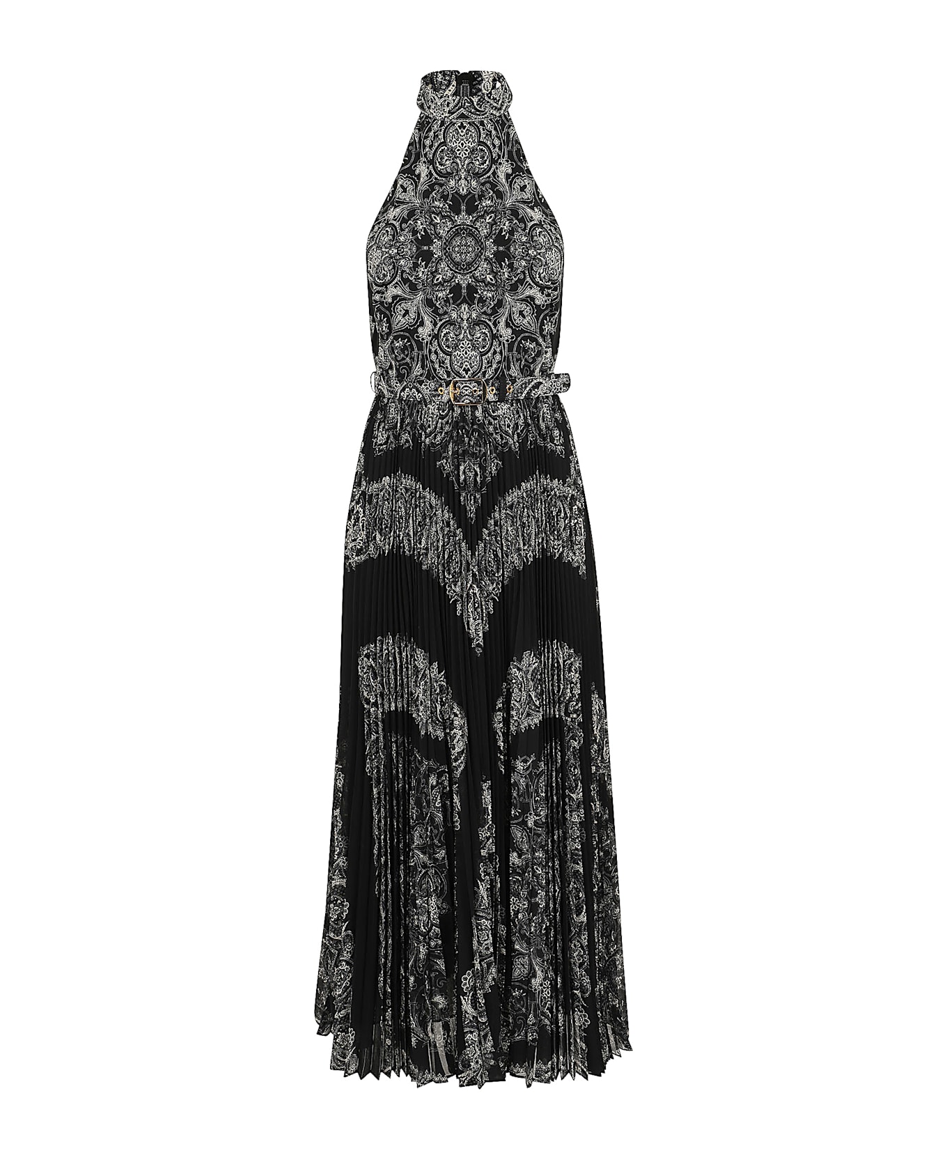 Sunray Halter Picnic Dress in Black Paisley BY ZIMMERMANN. High collar; invisible zip closure at the center of the back; belt loops with removable buckle. Sunray pleated skirt design.