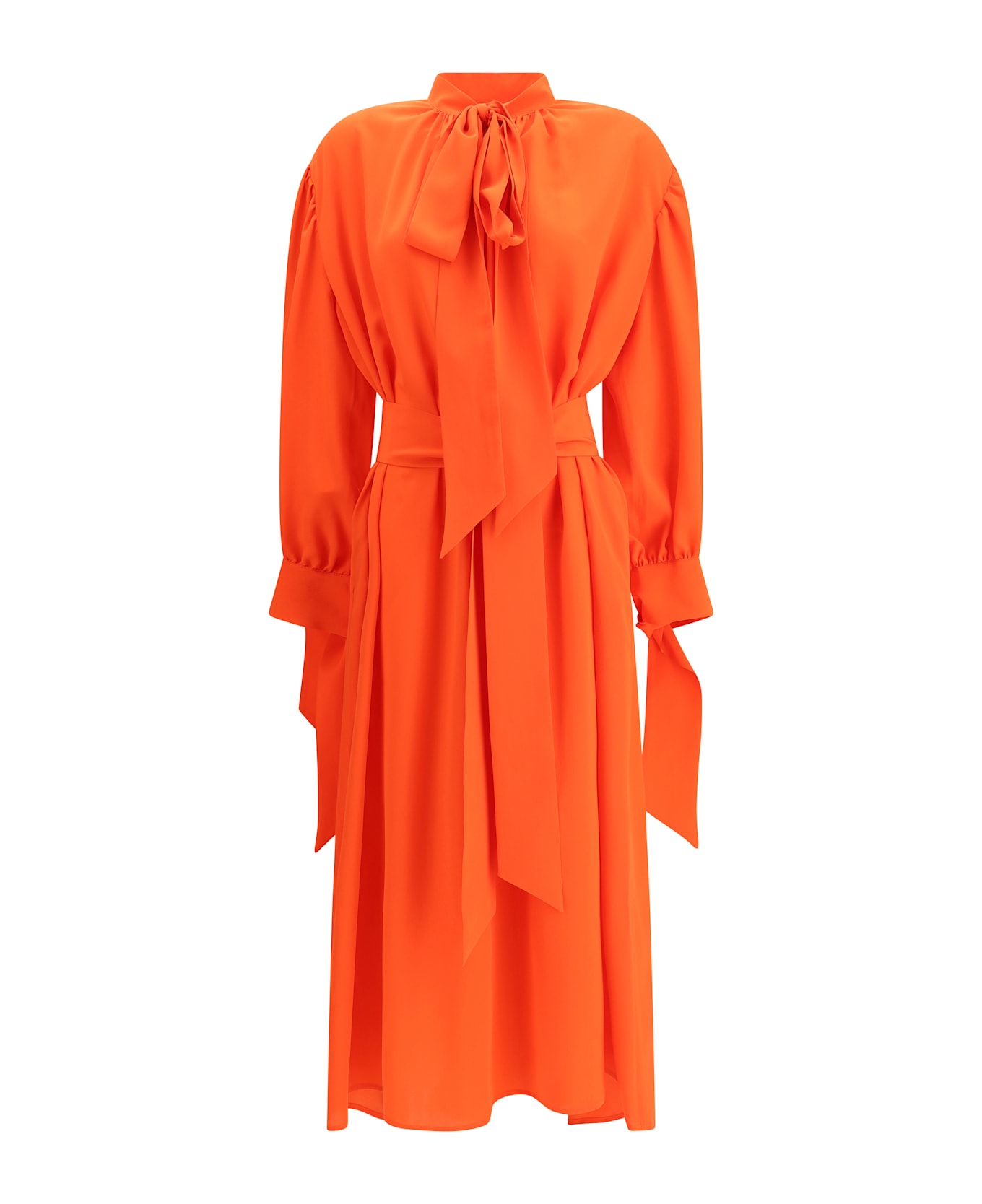 Sa su phi's susanna long dress in crepe de chine is made of a lightweight fabric with a matte finish that enhances flowing movements, lending an elegance of modern grace. featuring soft ruffles, a knotted neckline and wide sleeves with long decorative ribbons, it is completed with a matching sash to stylishly define the silhouette.