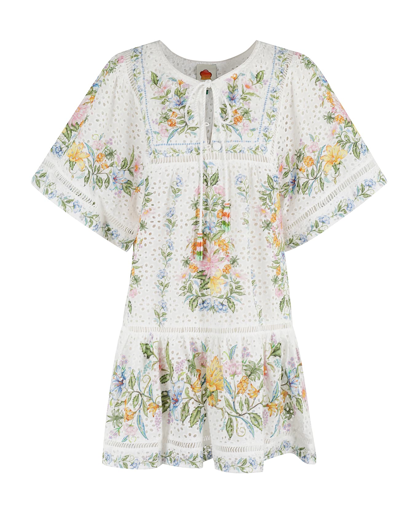 Sweet Bloom cover-up - Farm Rio - White color - Sangallo lace fabric with floral print - V-neck with drawstring - Short kimono sleeve - Miniskirt with ruffle hem - Loose fit
