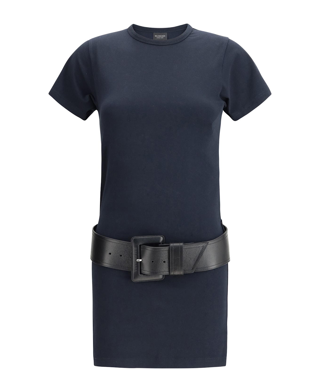 Balenciaga's t-shirt dress combines a casual aesthetic with a distinctive structured design. crafted with a ribbed crew neck and short sleeves, it is enhanced by waist loops that accommodate a matching, adjustable and removable leather maxi belt. a bold and contemporary piece that sculpts the silhouette while maintaining a casual spirit.