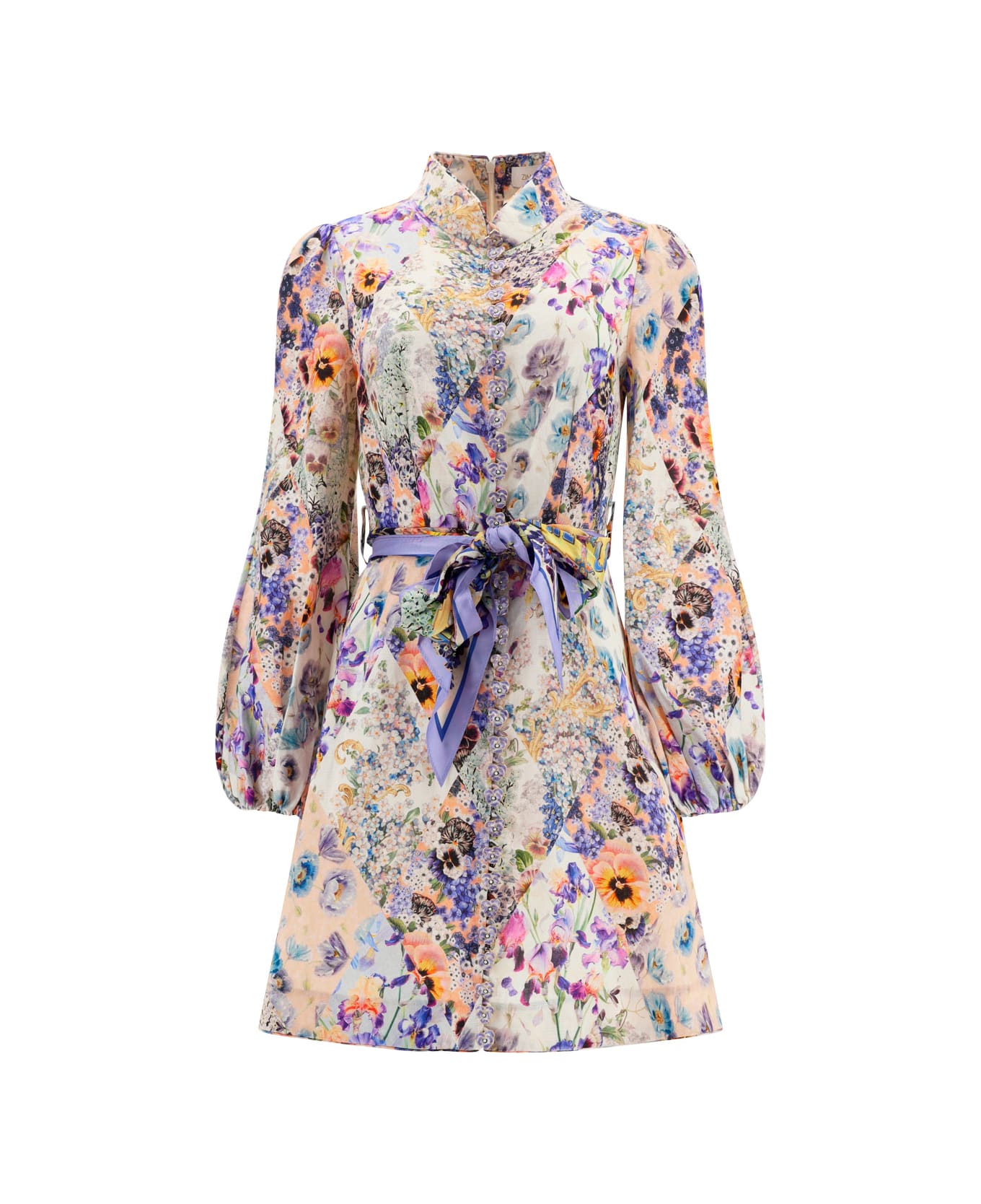 Linen tama dress by zimmermann, long-sleeved design, high neckline, front closure with flower jewel buttons, waist belt loops, scarf sash, second back zipper closure, multicolored geometric paneled floral pattern.