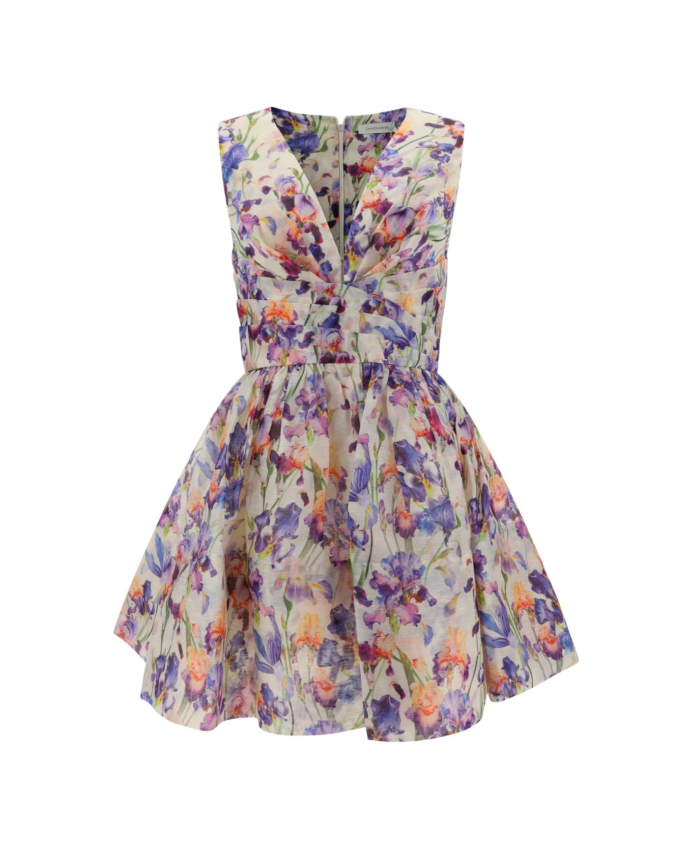 Linen mini tana dress by zimmermann, deep v-neck front, wide straps, pleated appliqué band on front, all-over printed multicolor floral graphic pattern, smock stitch on front, concealed back zipper closure, wide skirt.