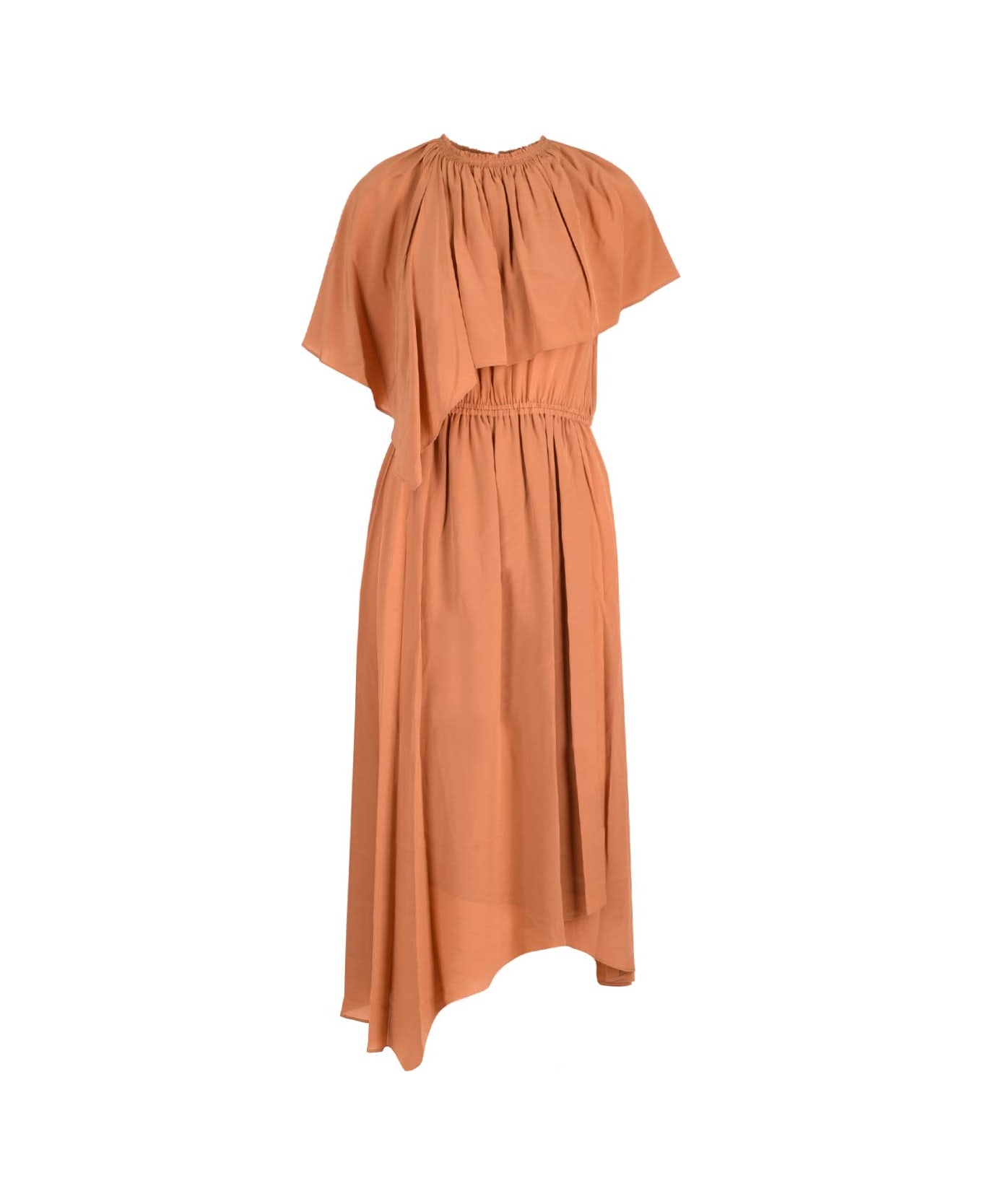 "Thalia" midi dress from Ulla Johnson, in pastel orange silk crepe, with asymmetrical design and gathered waist, midi skirt.