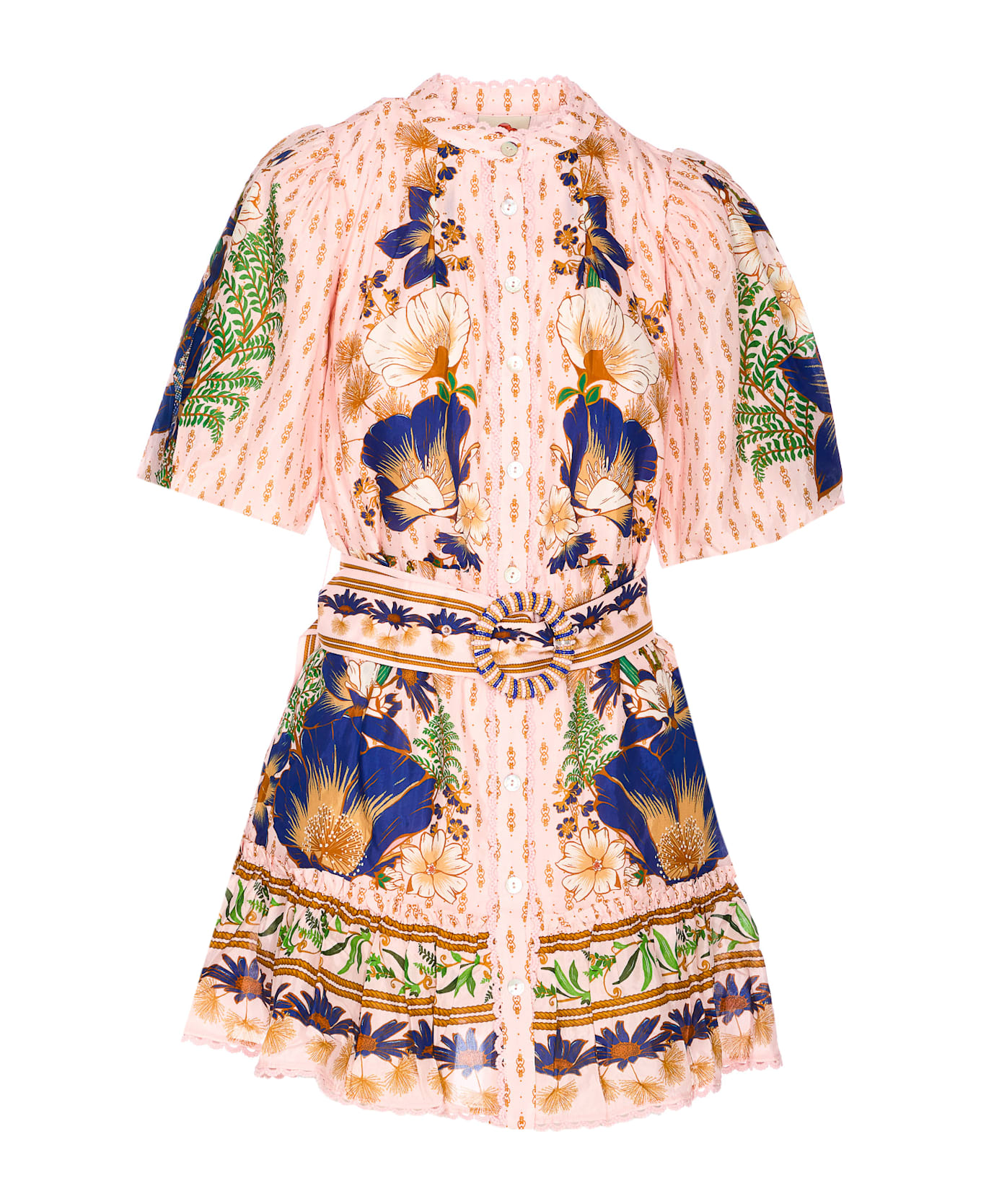 Farm Rio pink The Dream Garden dress, button closure, crewneck, short sleeves, printed, mini model, belt on waist