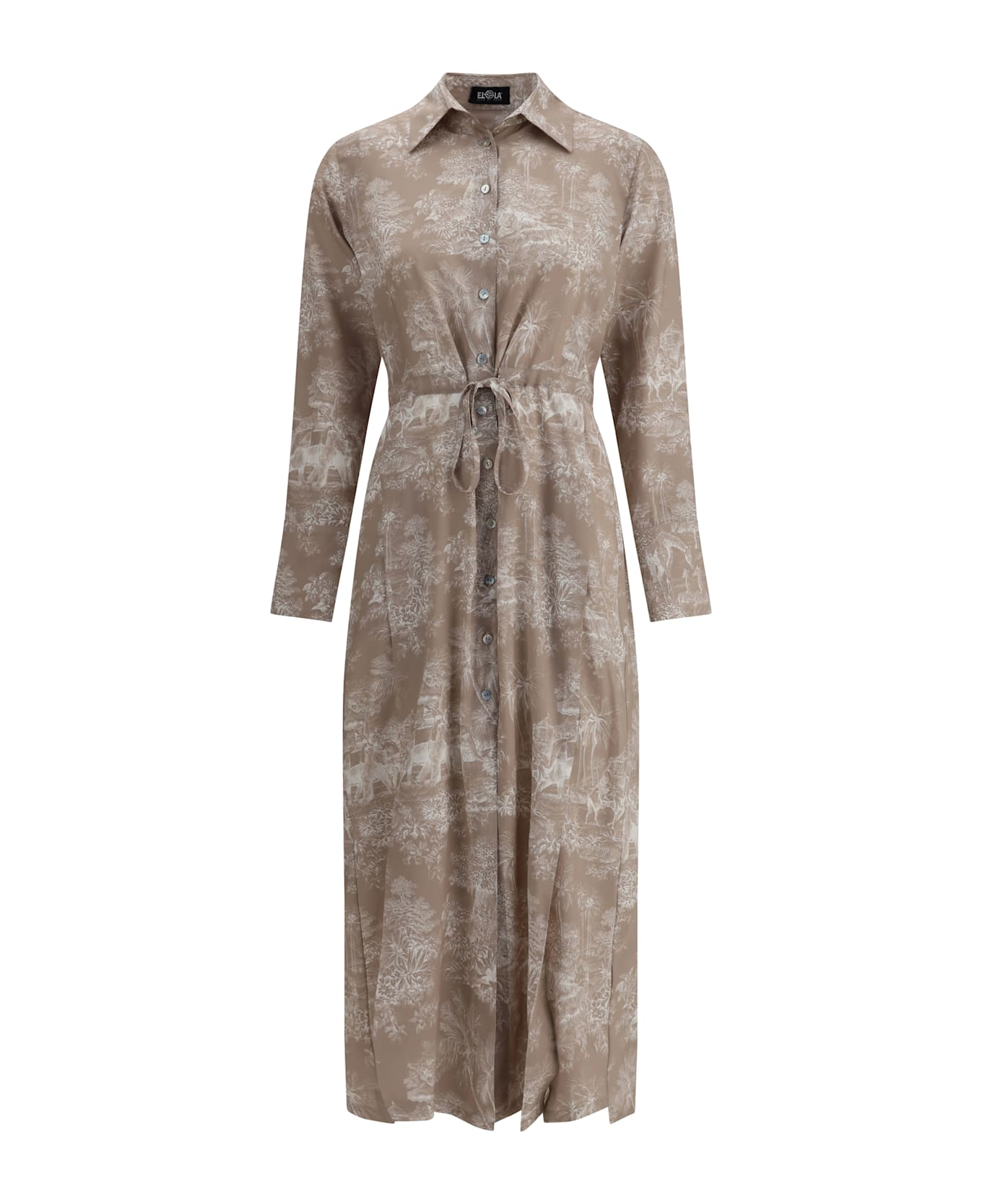 Ella's coulisse chemisier dress is an elegant and sophisticated piece with a classic collar and front button closure that emphasize its refined design. the adjustable drawstring waist allows it to fit the figure perfectly, while the two side welt pockets offer practicality. the built-in v-neck slip adds a feminine touch. the toile de jouy-style pattern, with its delicate and sophisticated pattern, lends an added accent of elegance. a perfect dress for those seeking a chic and original look.