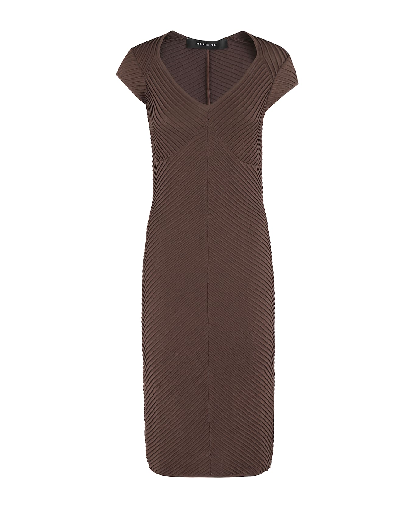 Dress - Federica Tosi - Chocolate color - Embossed patterned jersey fabric - V-neck - Cap sleeve - Fitted fit