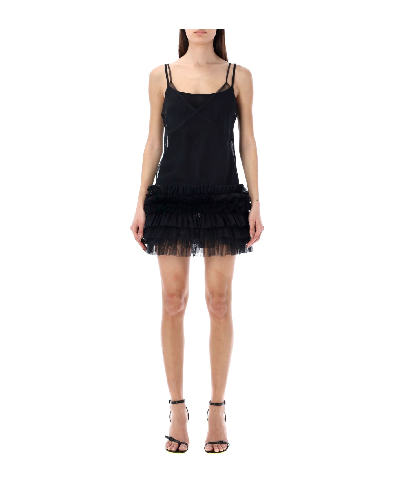 Tulle Mini Dress By Msgm. Featuring: V-neck Adjustable Spaghetti Straps Ruffled Flounced Hem Unlined The Model Is 1,72 M Tall And She's Wearing Size 40