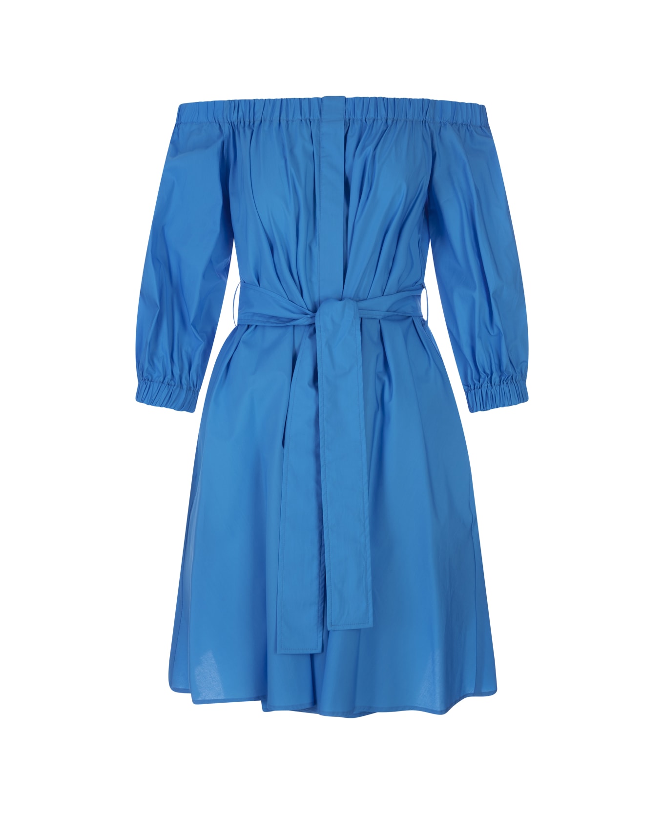 P. A. R. O. S. H. mini dress made of turquoise cotton with bare shoulders, puffed sleeves, flared skirt, neckline with elasticated cuffs, waistband with matching belt to tie at the front.