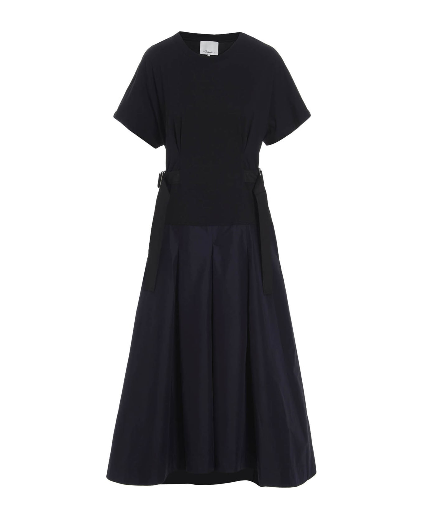 Two-tone blue and black dress with short-sleeved crew-neck cotton t-shirt, adjustable waist straps, pleated cotton-blend poplin skirt with pockets. Composition: