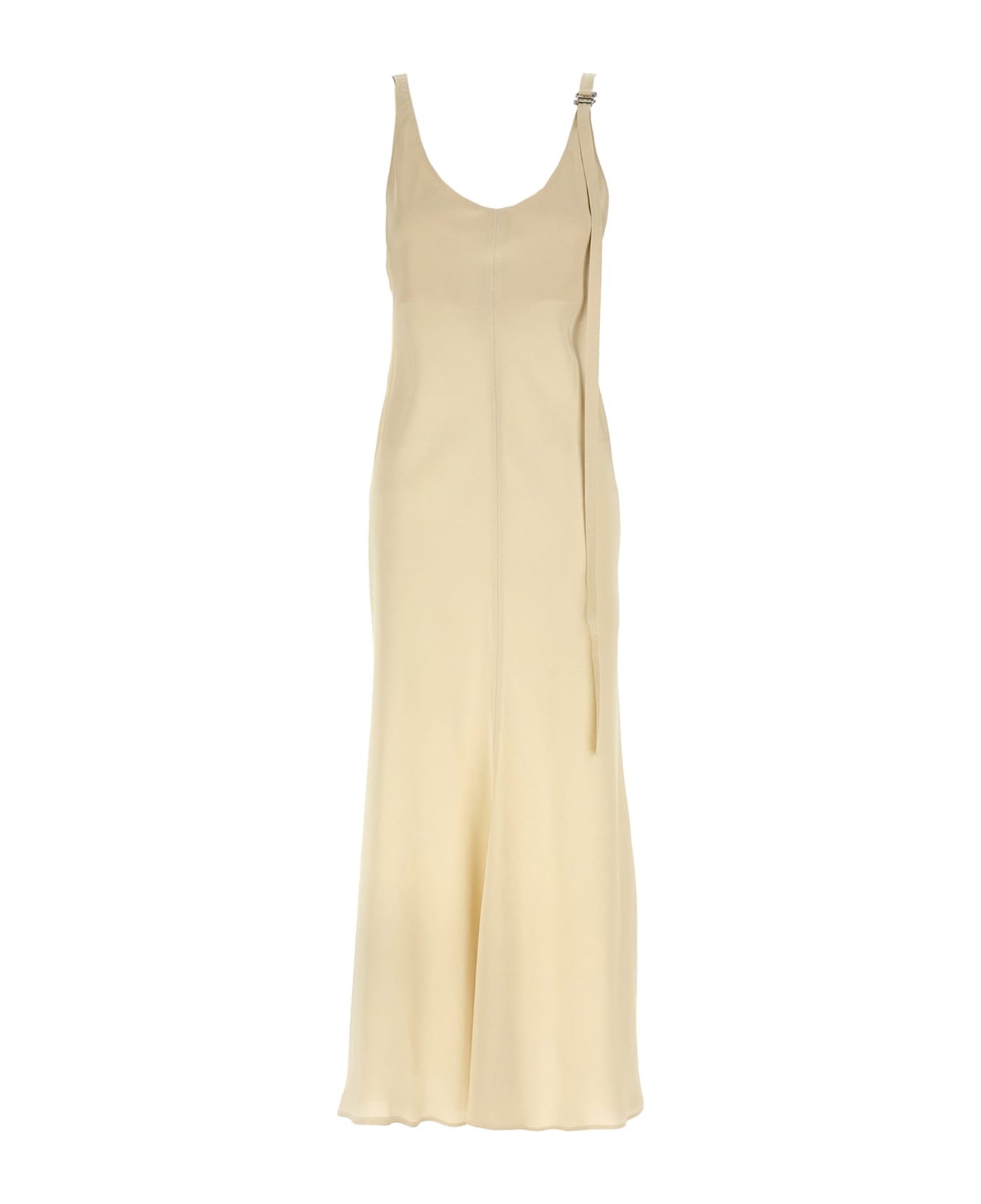 Long 'Unione' viscose dress, V-neck, sleeveless with thin adjustable straps and metal logo detail, mermaid skirt.