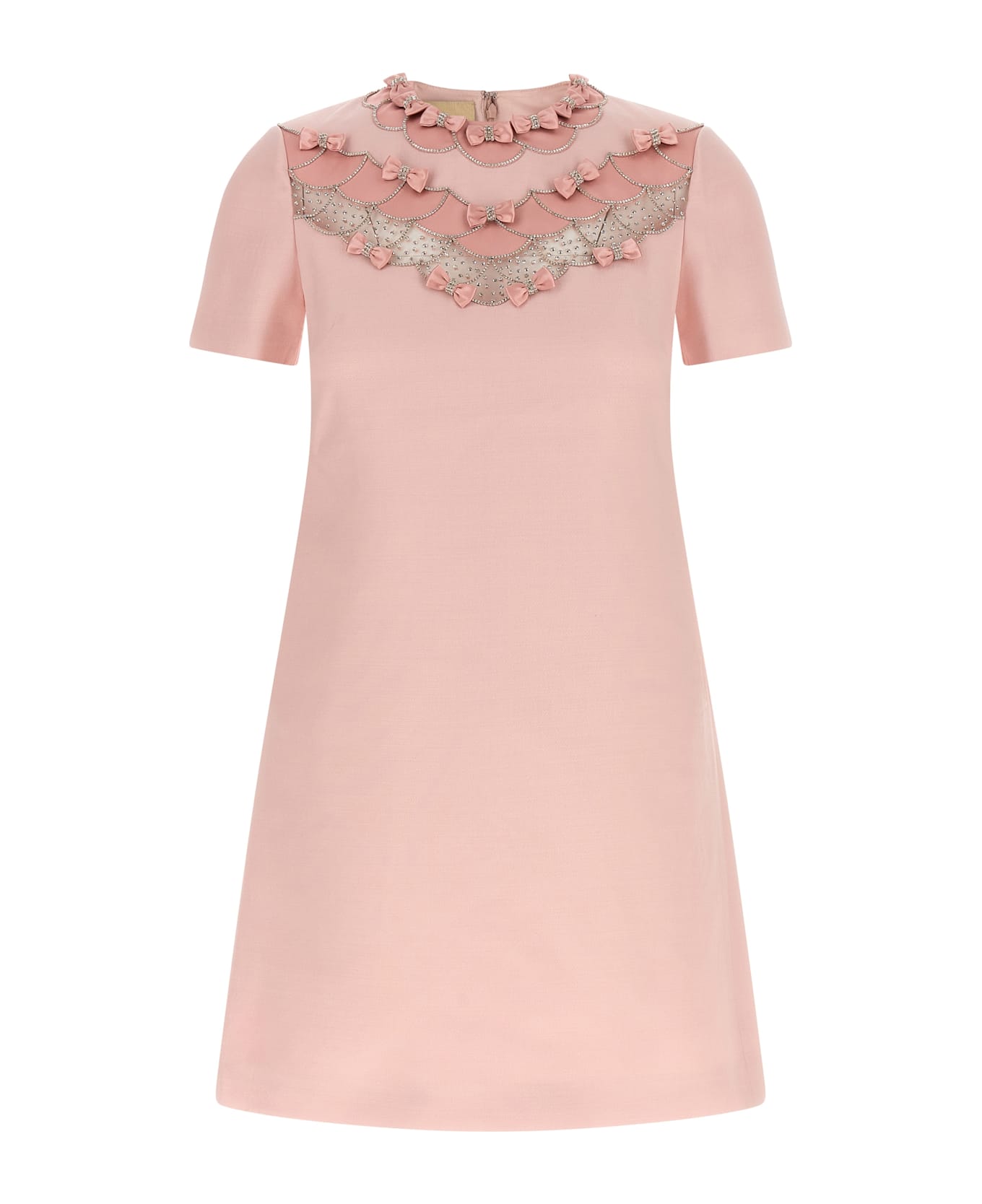 Crêpe Couture mini dress with front top with semi-transparent tulle inserts, tone-on-tone satin, jewel bows and crystals, crew neck, short sleeves, back zip closure, Habotai lining. Composition: 65% virgin wool 35% silk