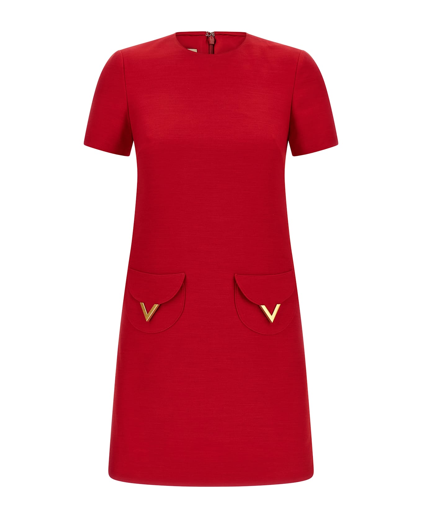 Solid Crêpe Couture mini dress, pockets with antiqued metallic V Gold detail, crew neck, back zip closure, short sleeves, Habotai lining. Composition: 65% virgin wool 35% silk